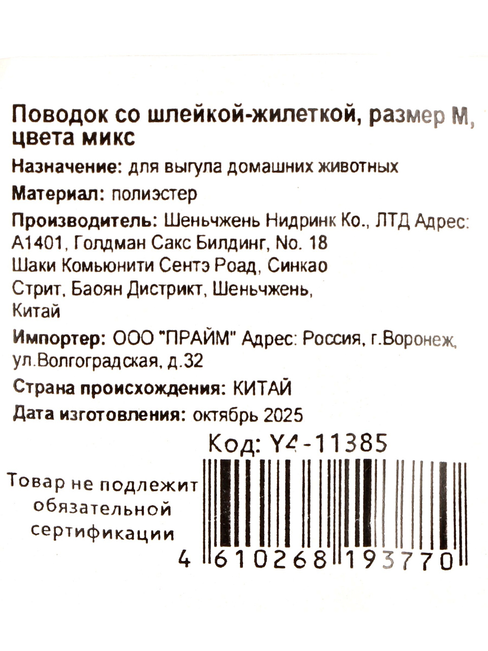 Поводок со шлейкой-жилеткой Y4-11385 (размер M, цвета микс): комфорт и безопасность для прогулок с питомцем по доступной цене — оптимальный выбор для дома, дачи и подарка.
