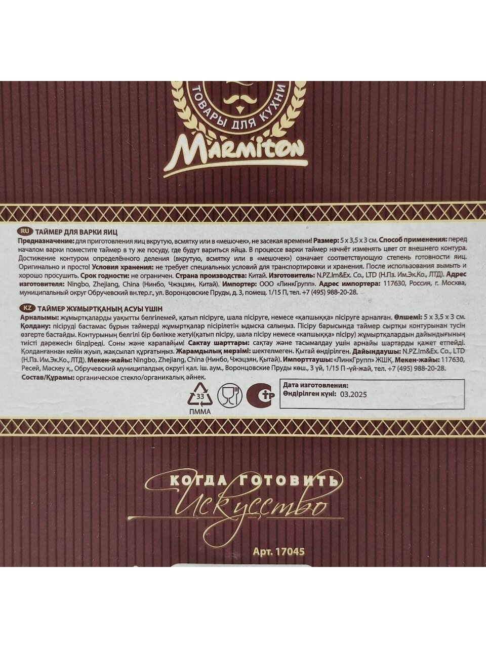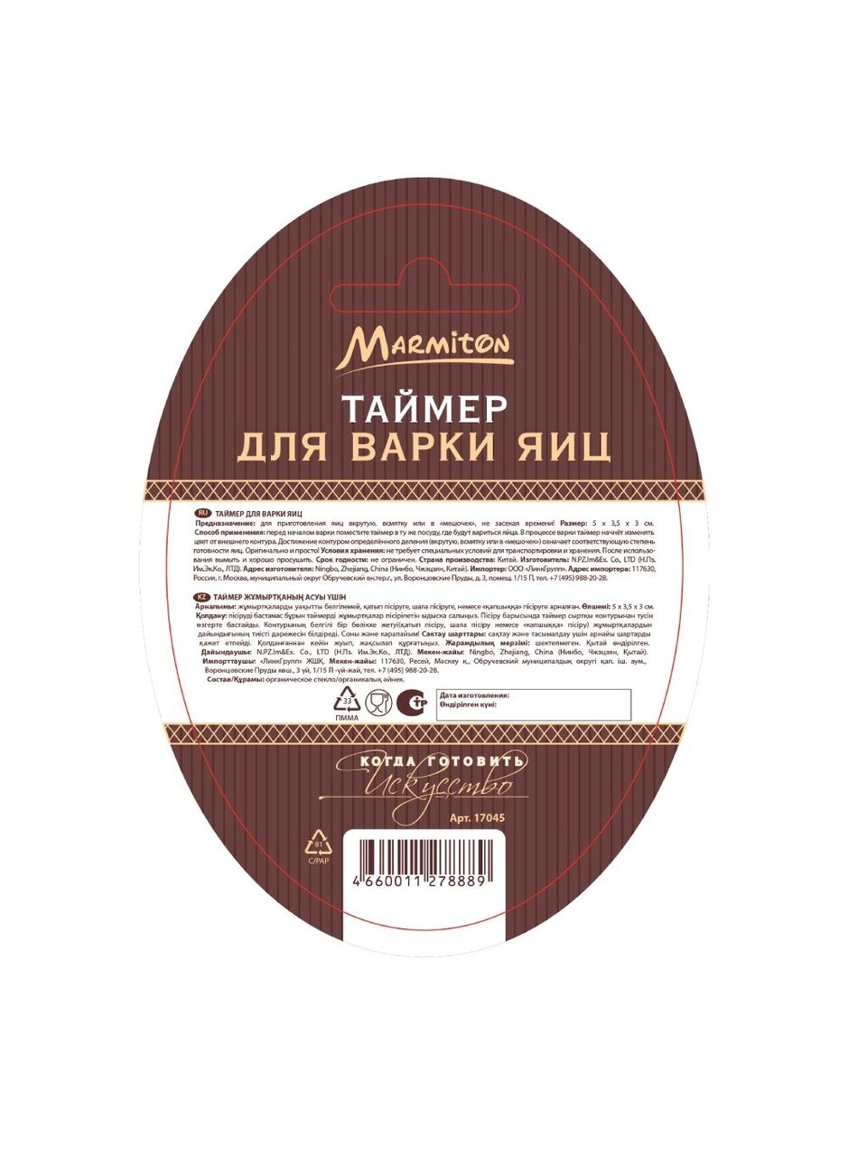 Вы можете приобрести «Таймер для варки яиц 5х3.5х3 см, навеска, Marmiton, 17045» и другие товары в нашем интернет-магазине в Ставрополе по низким ценам и с бесплатным самовывозом.