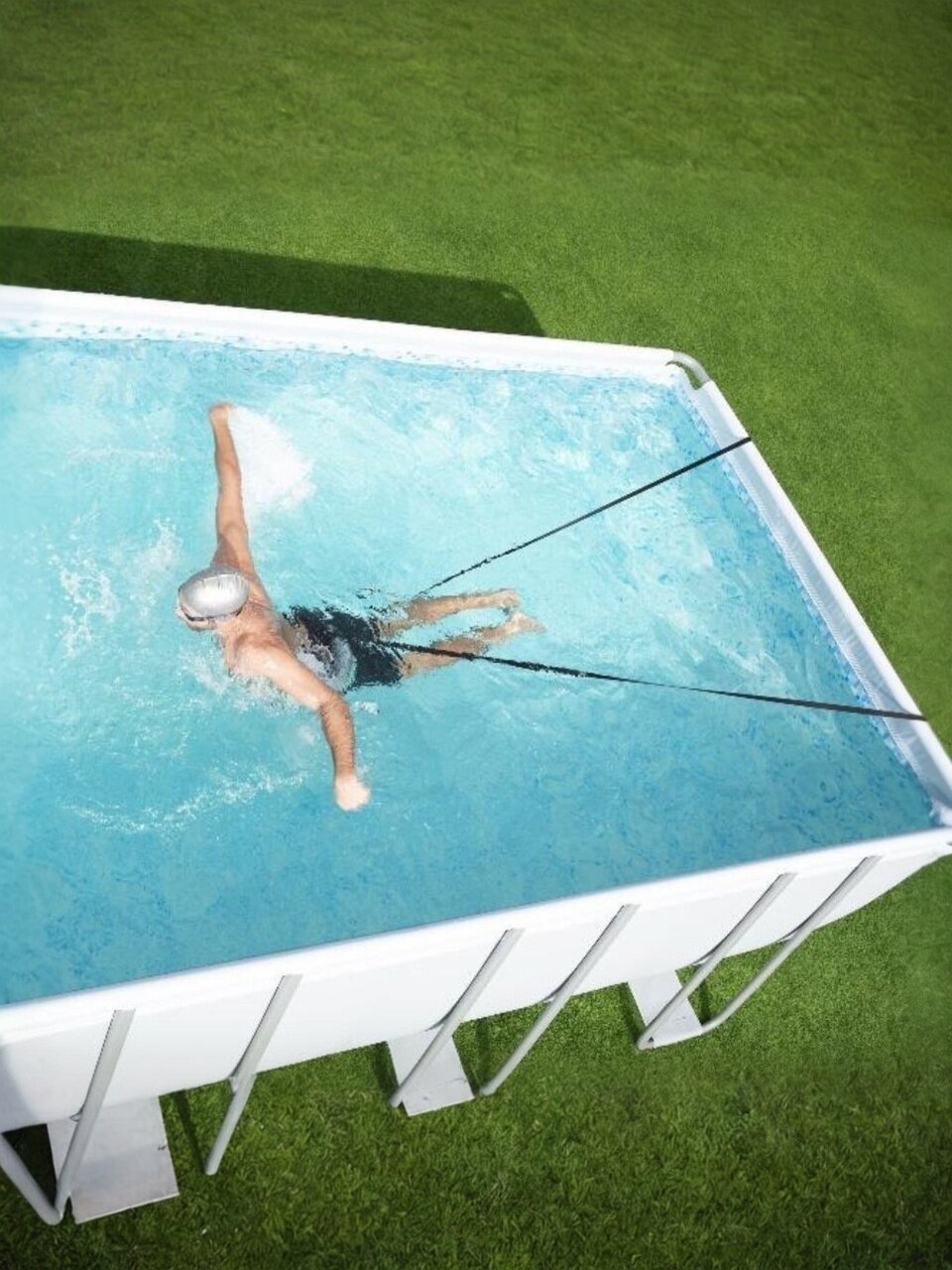 Тренажер действует следующим образом: вы начинаете плыть сначала без сопротивления, потом, когда трос начинает постепенно растягиваться, возрастает сопротивление и вам приходится прикладывать все больше усилий, чтобы продвинуться вперед.