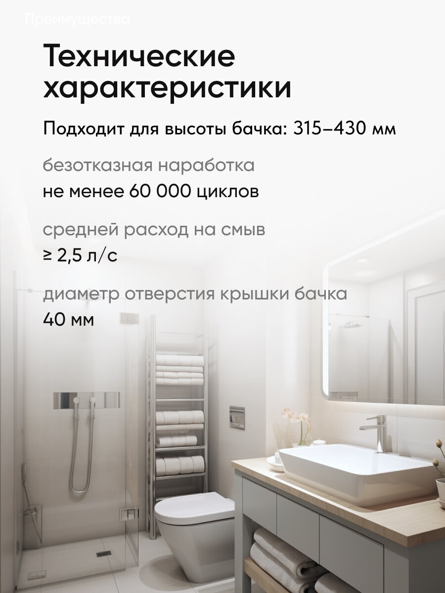- Усилие и время воздействия на кнопку для спуска воды 20Н и 2с.