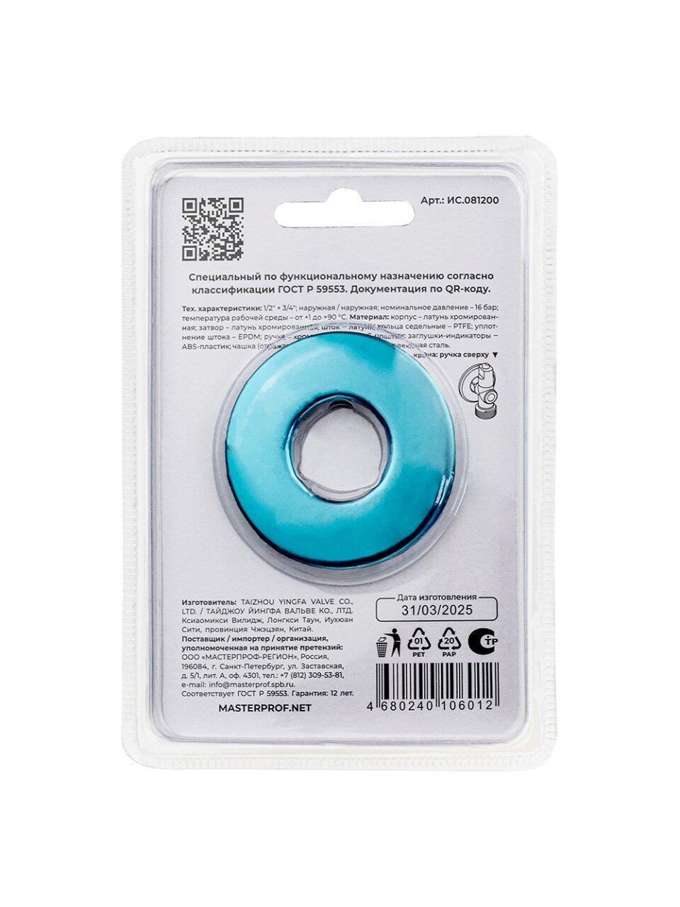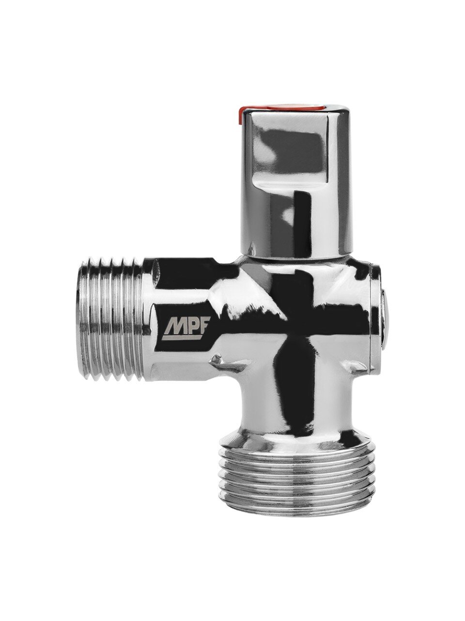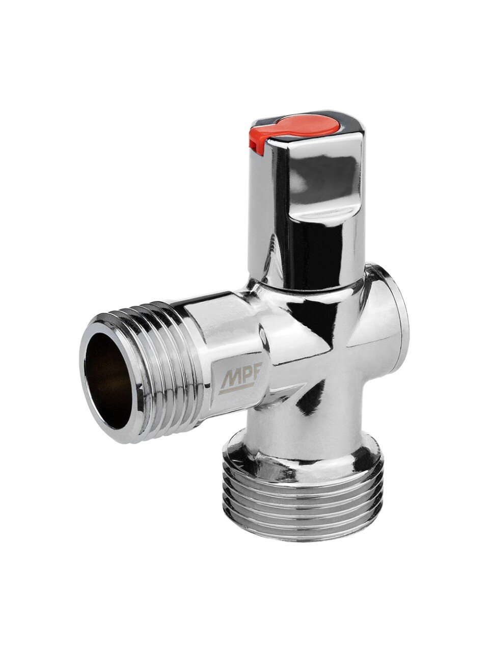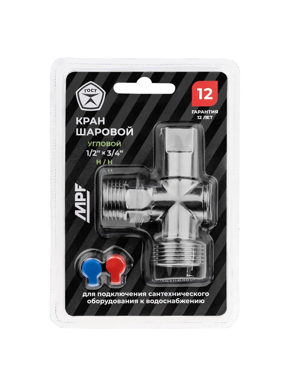 Угловой шаровой кран 1/2" х 3/4" MasterProf — надёжное решение для подключения бытовой техники: гарантия 12 лет, хромированная латунь, удобная верхняя ручка.