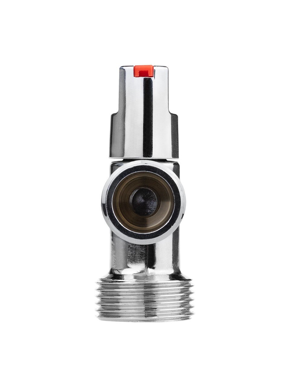 Диаметр подключения — 1/2" х 3/4", тип соединения — наружная резьба (ш-ш), в комплекте отражатель и индикаторные заглушки. Материал корпуса — латунь, покрытие — хром, ручка из ABS-пластика.