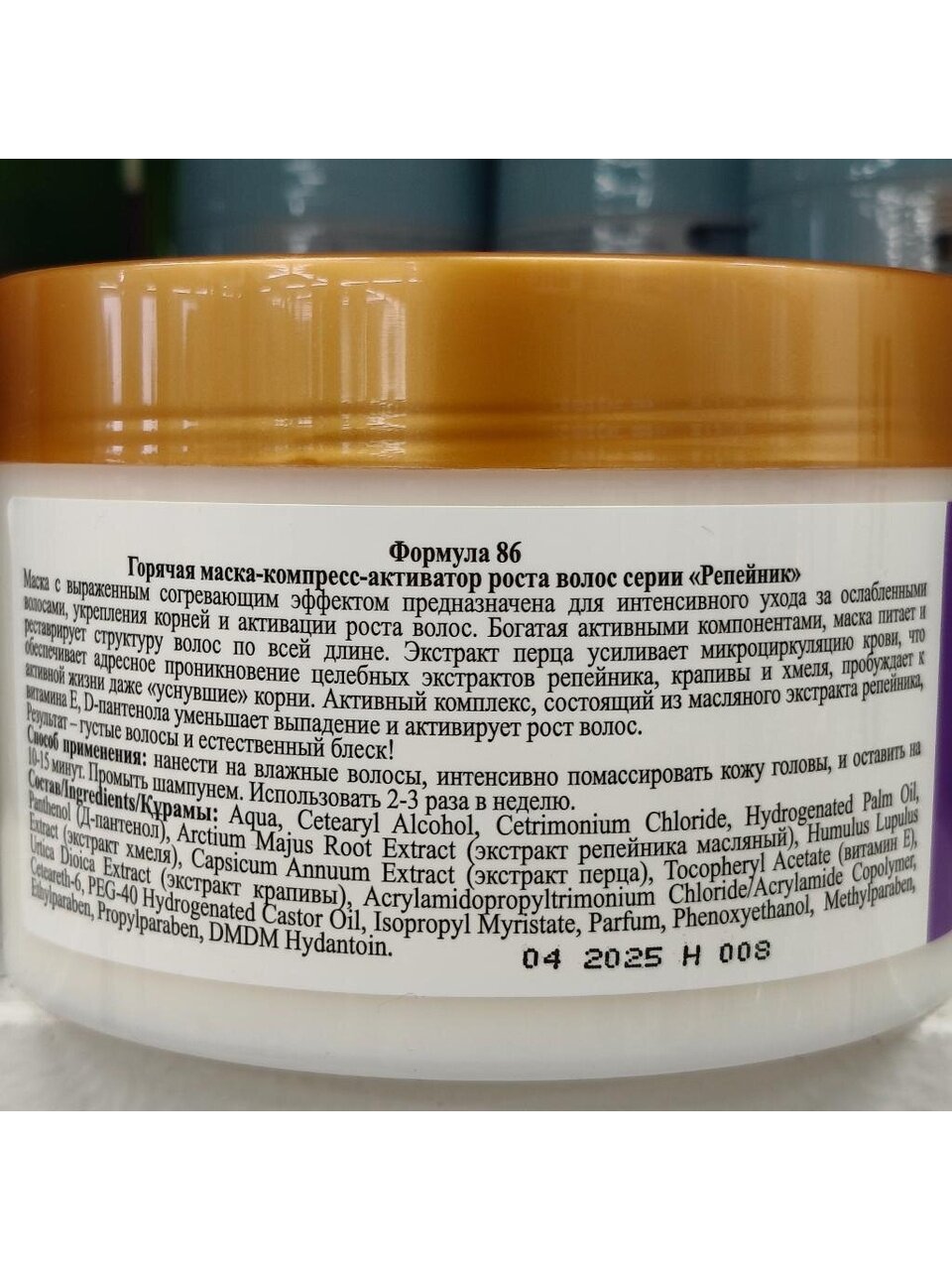 Маска с выраженным согревающим эффектом предназначена для интенсивного ухода за ослабленными волосами, укрепления корней и активации роста волос. Богатая активными компонентами, маска питает и реставрирует структуру волос по всей длине. Экстракт перца усиливает микроциркуляцию крови, что обеспечивает адресное проникновение целебных добавок, пробуждает к активной жизни даже уснувшие корни. Активный комплекс, состоящий из масла репейника, витамина Е, D-пантенола уменьшает выпадение и активирует рост волос.