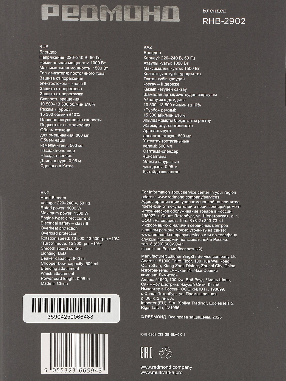Вы можете приобрести «Блендер погружной 1500 Вт, турбо режим, стакан, измельчитель, венчик, чаша, Редмонд, RHB-2902, черный» и другие товары в нашем интернет-магазине в Смоленске по низким ценам и с бесплатным самовывозом.