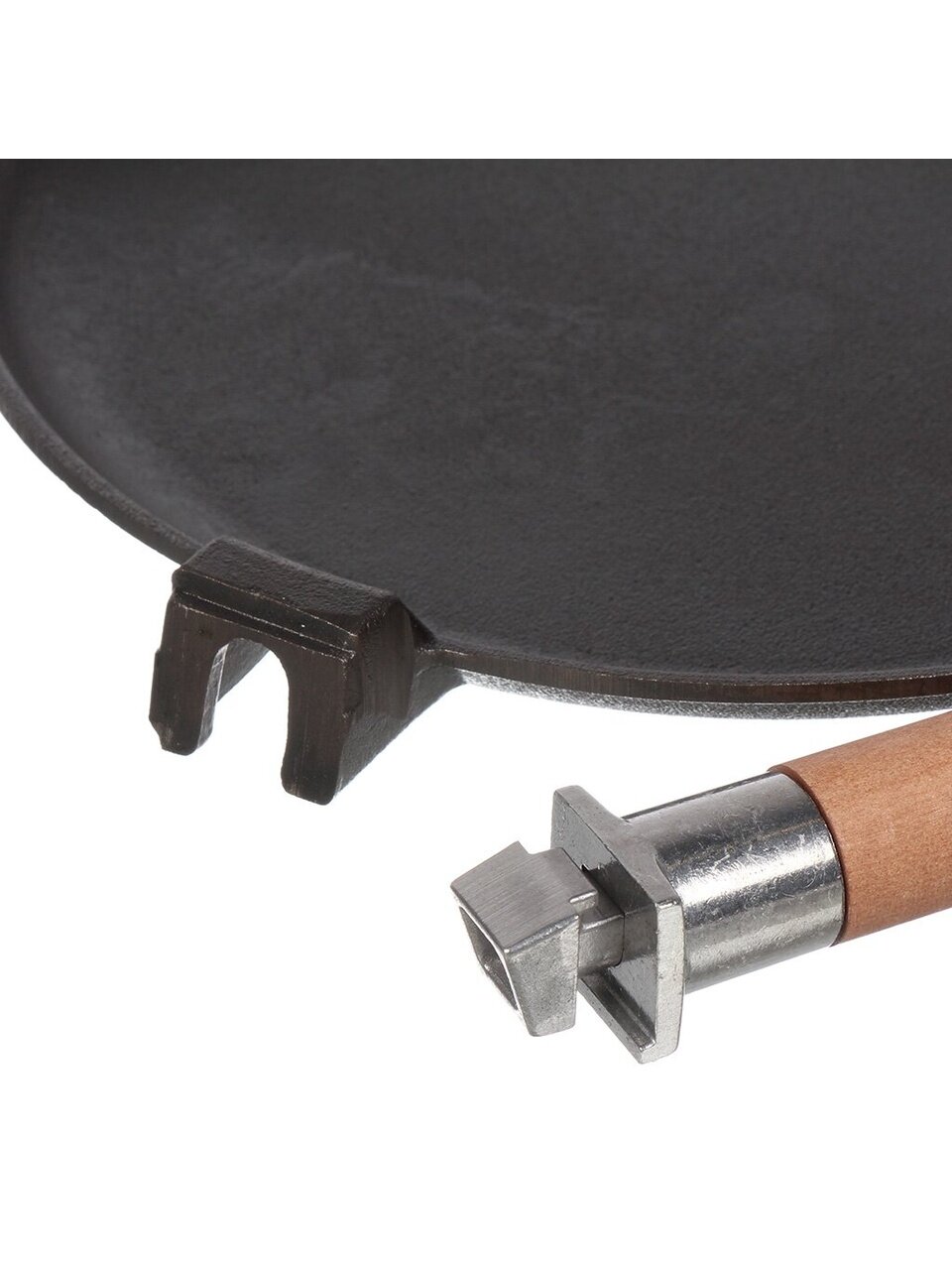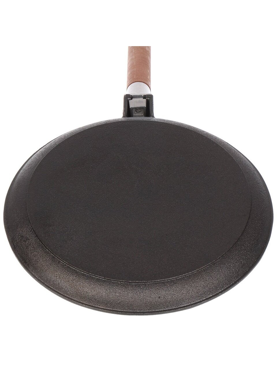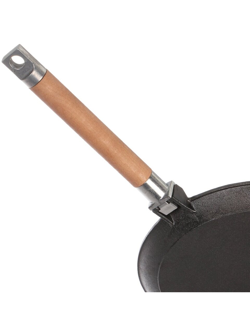 Блинница оснащена съемной деревянной ручкой, которая не нагревается, что делает процесс приготовления еще более комфортным и безопасным. Благодаря возможности использования на индукционных плитах, она подходит для самых современных кухонь. Блинница также совместима с газовыми, электрическими и стеклокерамическими плитами, что делает ее универсальной для любого типа кухни.