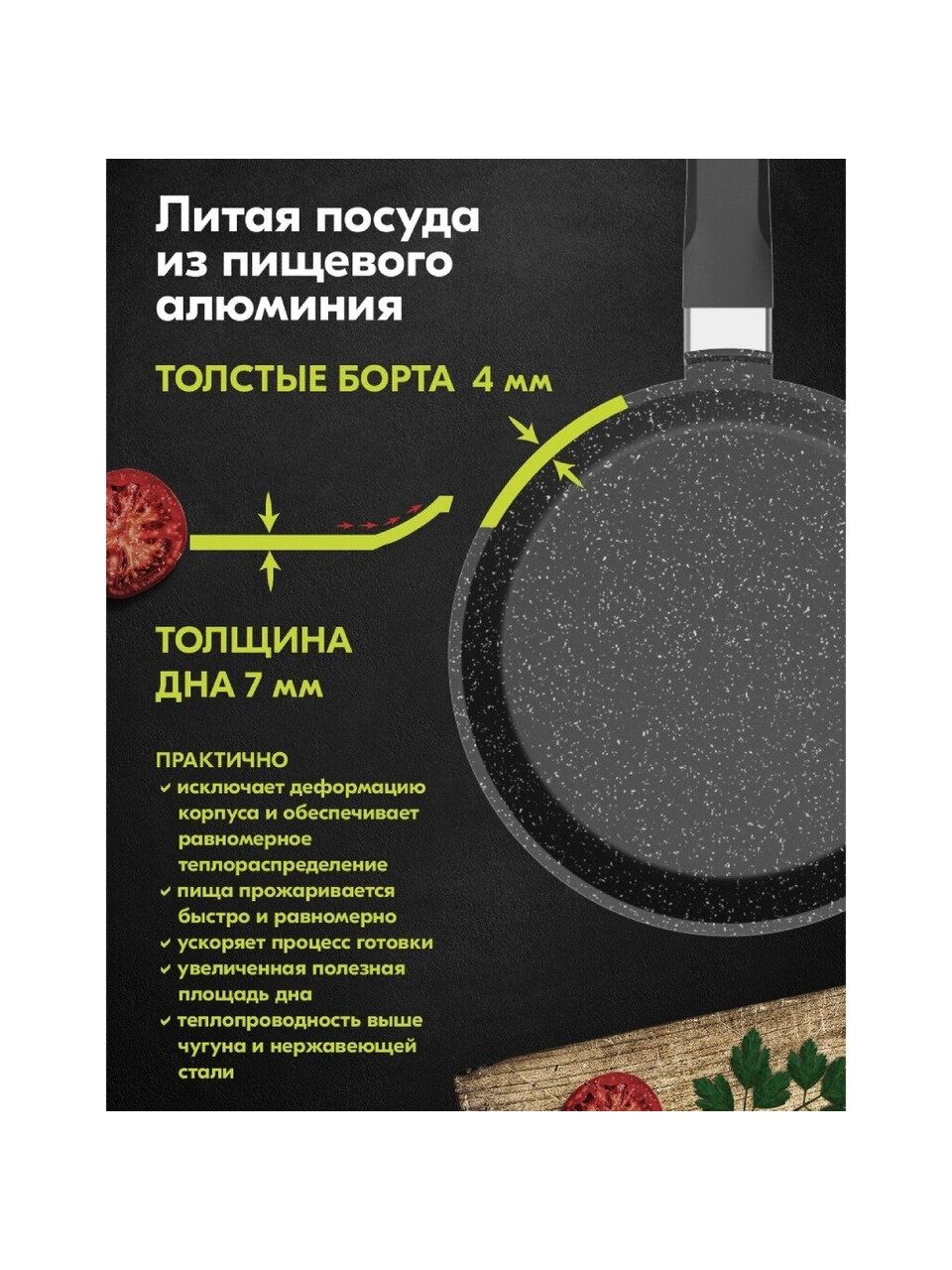 Высококачественный материал, эргономичная ручка, эстетичный внешний вид - позволят готовить с удовольствием, а отличные характеристики алюминия сохранят свойства на долгие годы.