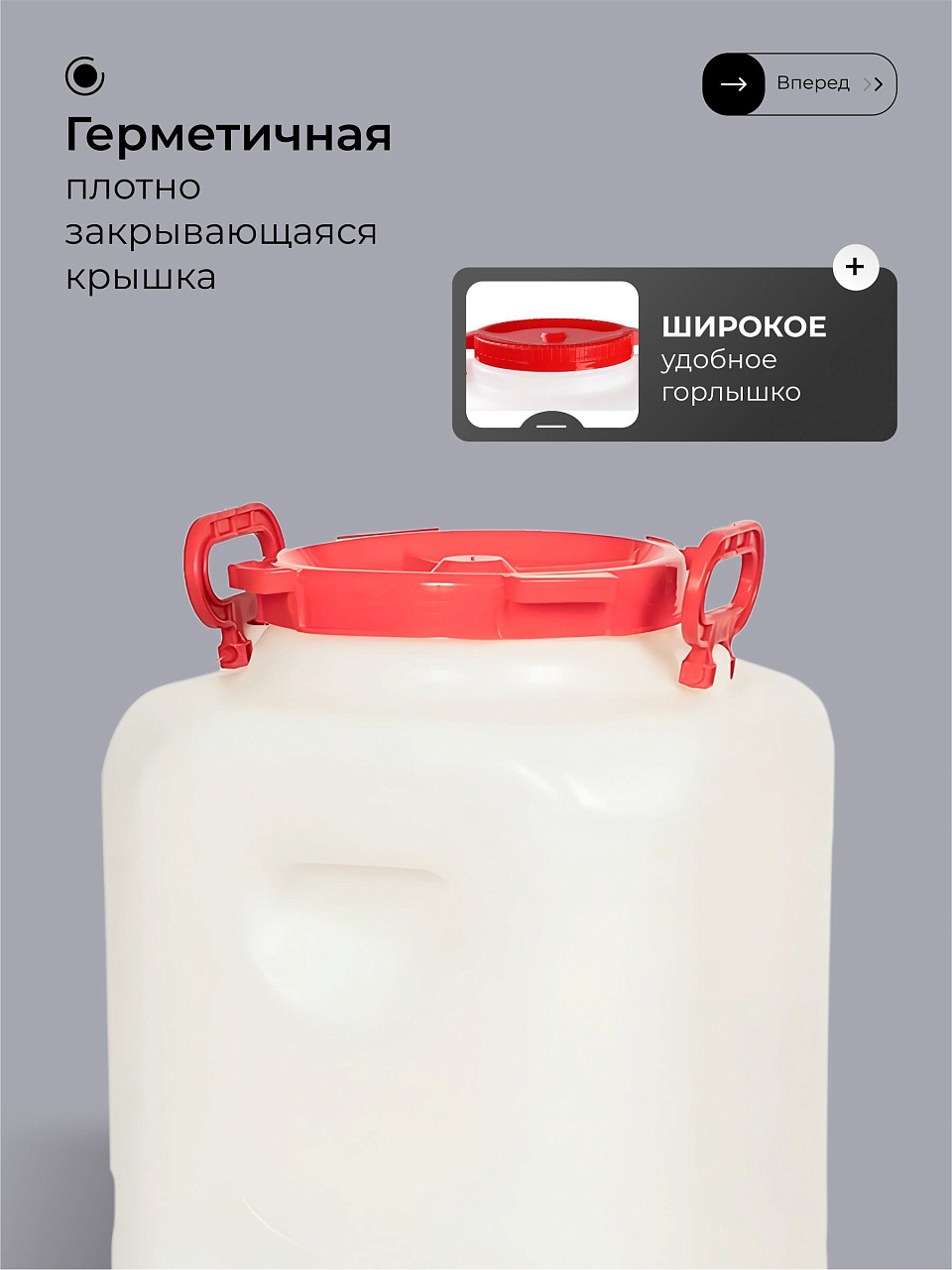 - Экологичный пластик, объём 50 л, диаметр горловины 195 мм — легко наливать и мыть