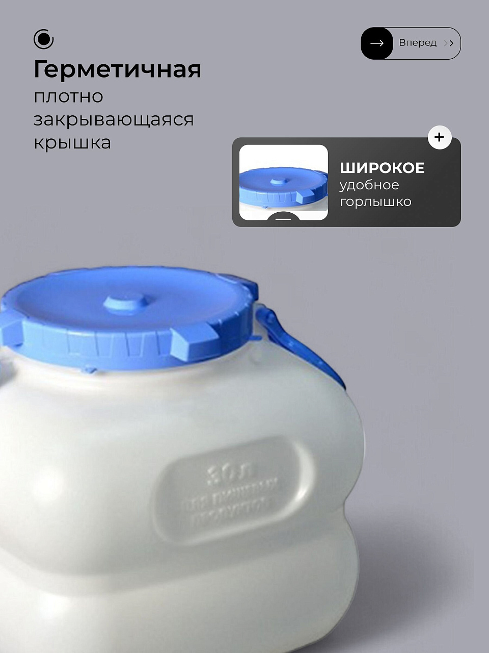 - Универсальность: подходит для хранения воды, сыпучих и жидких продуктов — дома, на даче, в поездках