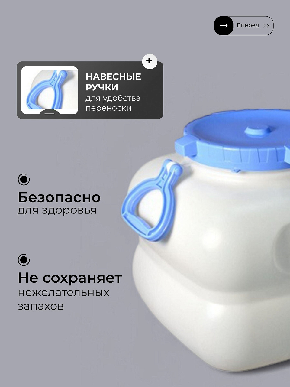 Ручки позволяют легко переносить даже полную бочку, а квадратная форма экономит место при хранении и транспортировке.
