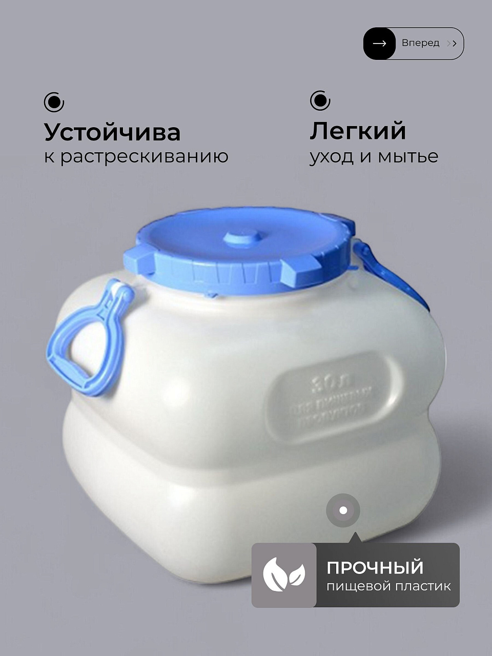 В отличие от аналогичных круглых моделей, квадратная форма позволяет максимально эффективно использовать пространство. Диаметр горловины 193 мм облегчает наполнение и мытье. Удобные ручки обеспечивают комфортную транспортировку даже при полной загрузке. Если вы ищете, какая бочка лучше для хранения воды или солений, обратите внимание на Martika Гранде — она не пропускает запахи и не выделяет вредных веществ, что подтверждено опытом покупателей и экспертными рекомендациями.
