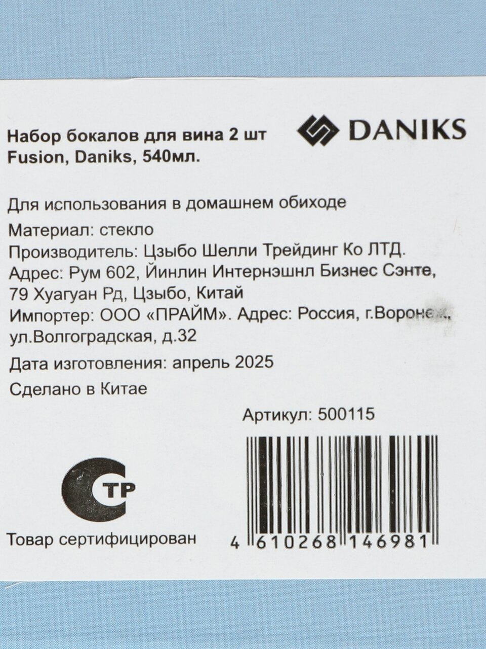 Бокал для вина, 540 мл, стекло, 2 шт, Fusion, Daniks