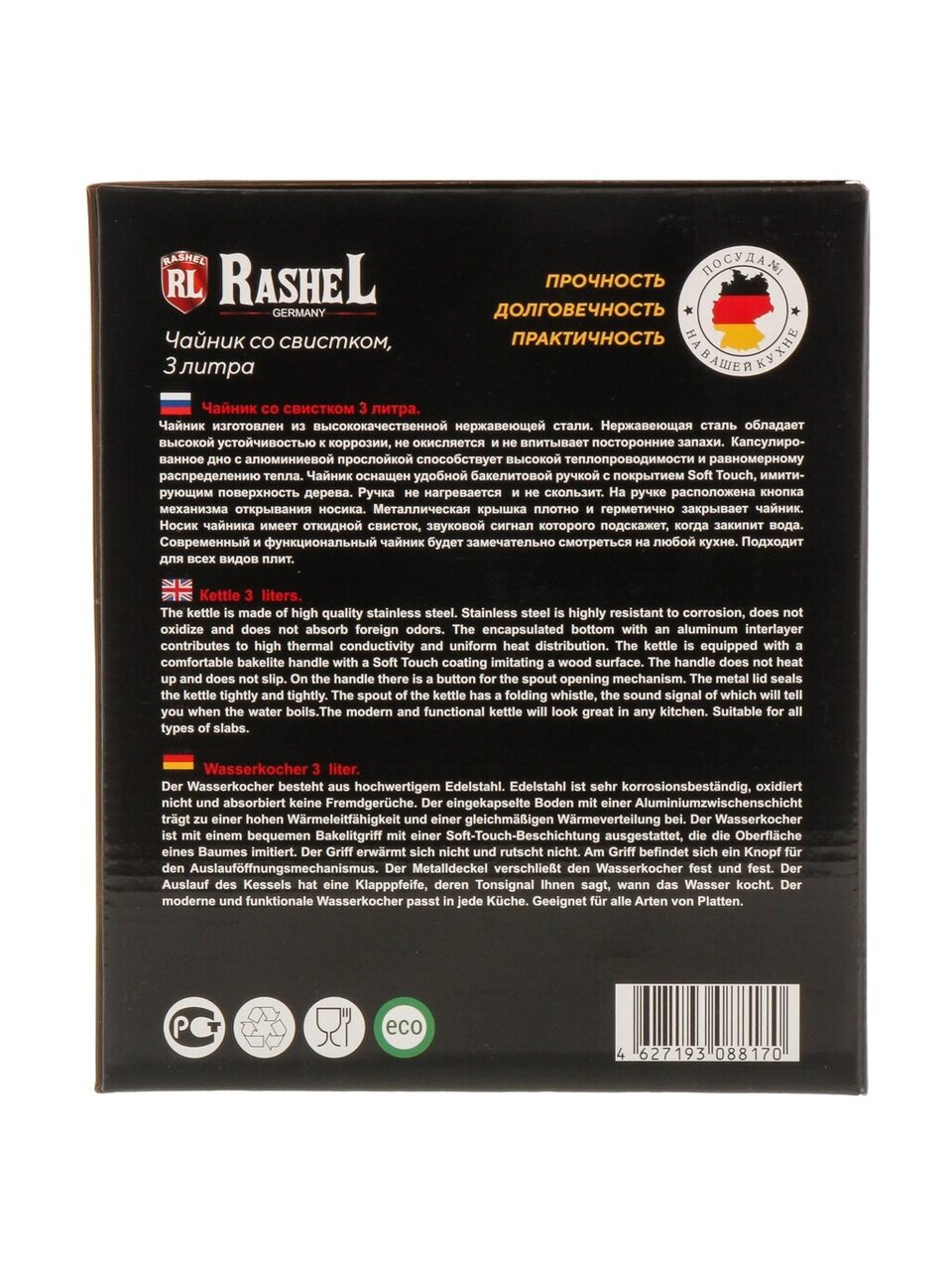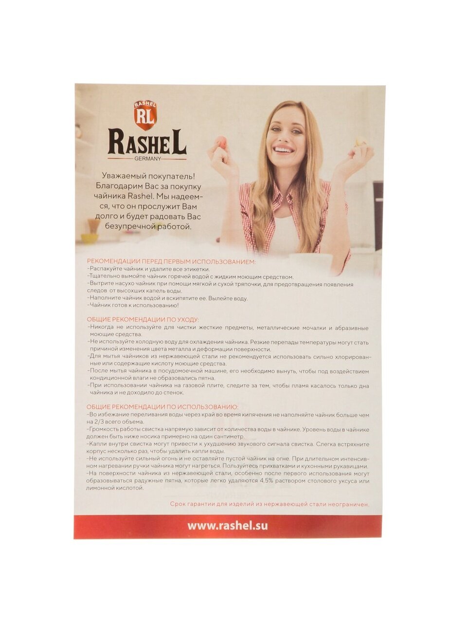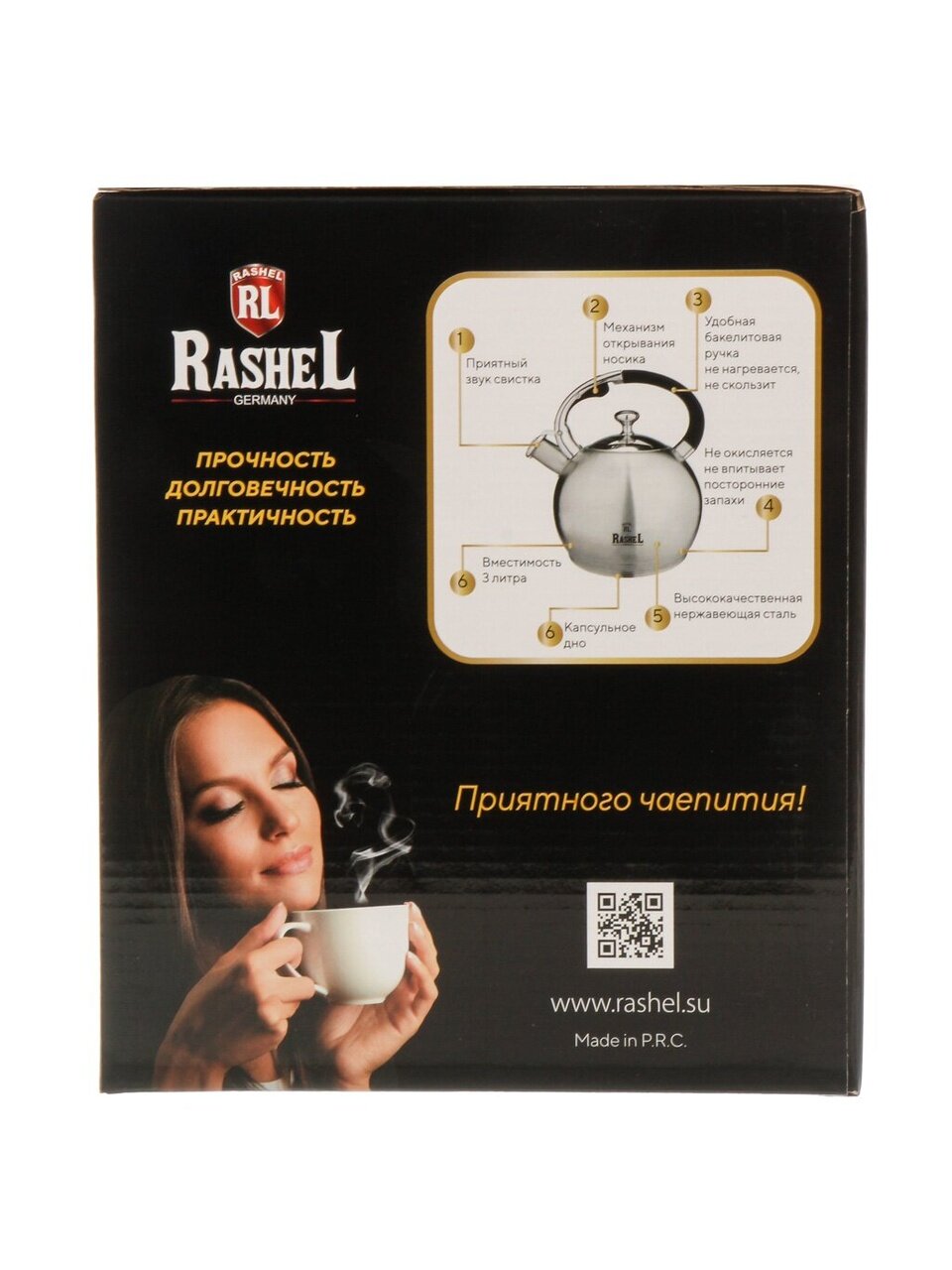 Термоизолированная бакелитовая ручка надежно защищает от ожогов и обеспечивает удобный захват даже при высокой температуре. Отсутствие эмалированного покрытия облегчает уход и продлевает срок службы изделия. Чайник RasheL — это выбор для тех, кто ценит качество, функциональность и стиль в каждой детали.
