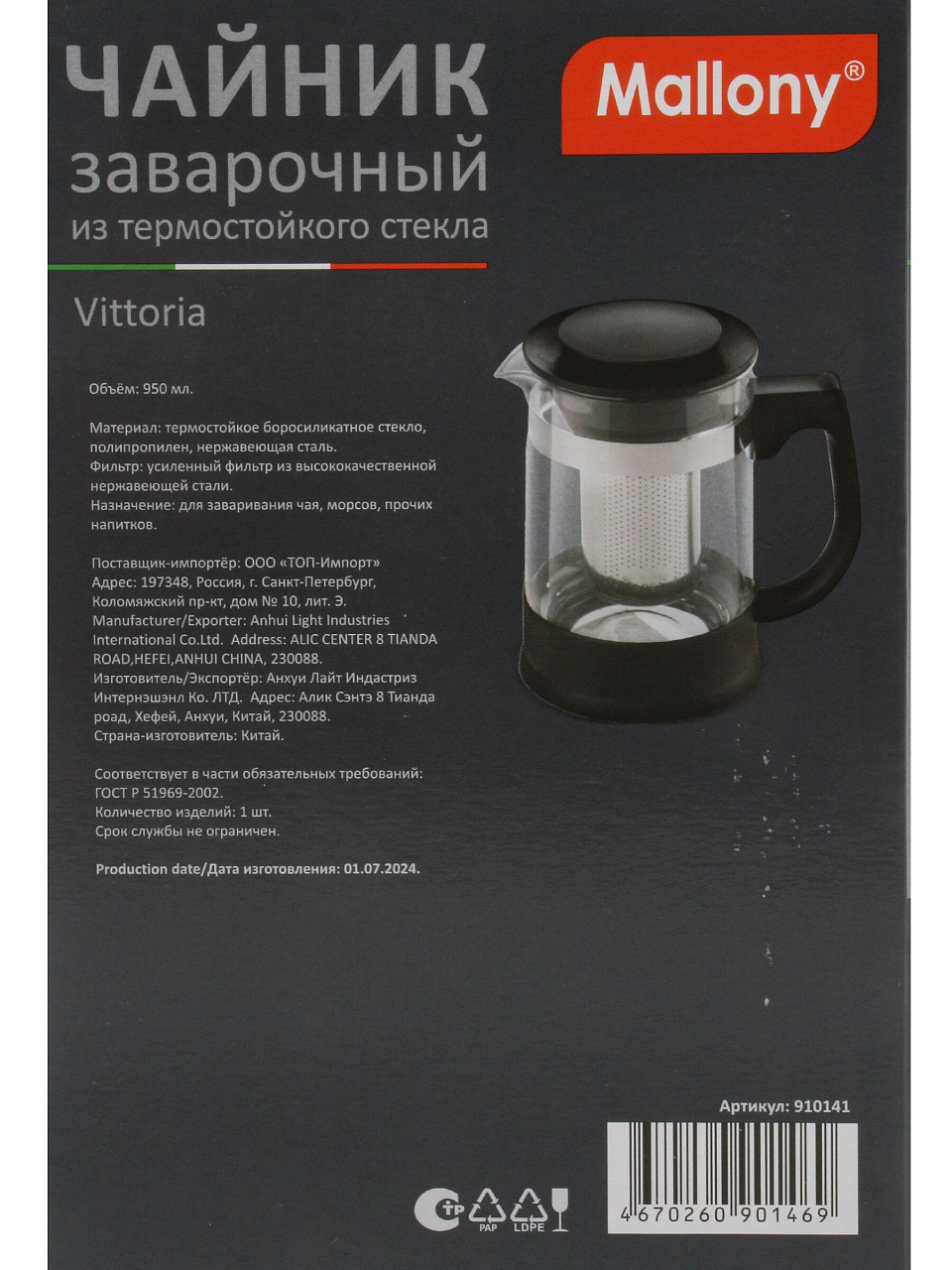 Вы можете приобрести «Чайник заварочный стекло, нержавеющая сталь, 0.95 л, с ситечком, с пластиковой ручкой-крышкой, Mallony, Vittoria, 910141» и другие товары в нашем интернет-магазине в Железногорске по низким ценам и с бесплатным самовывозом.