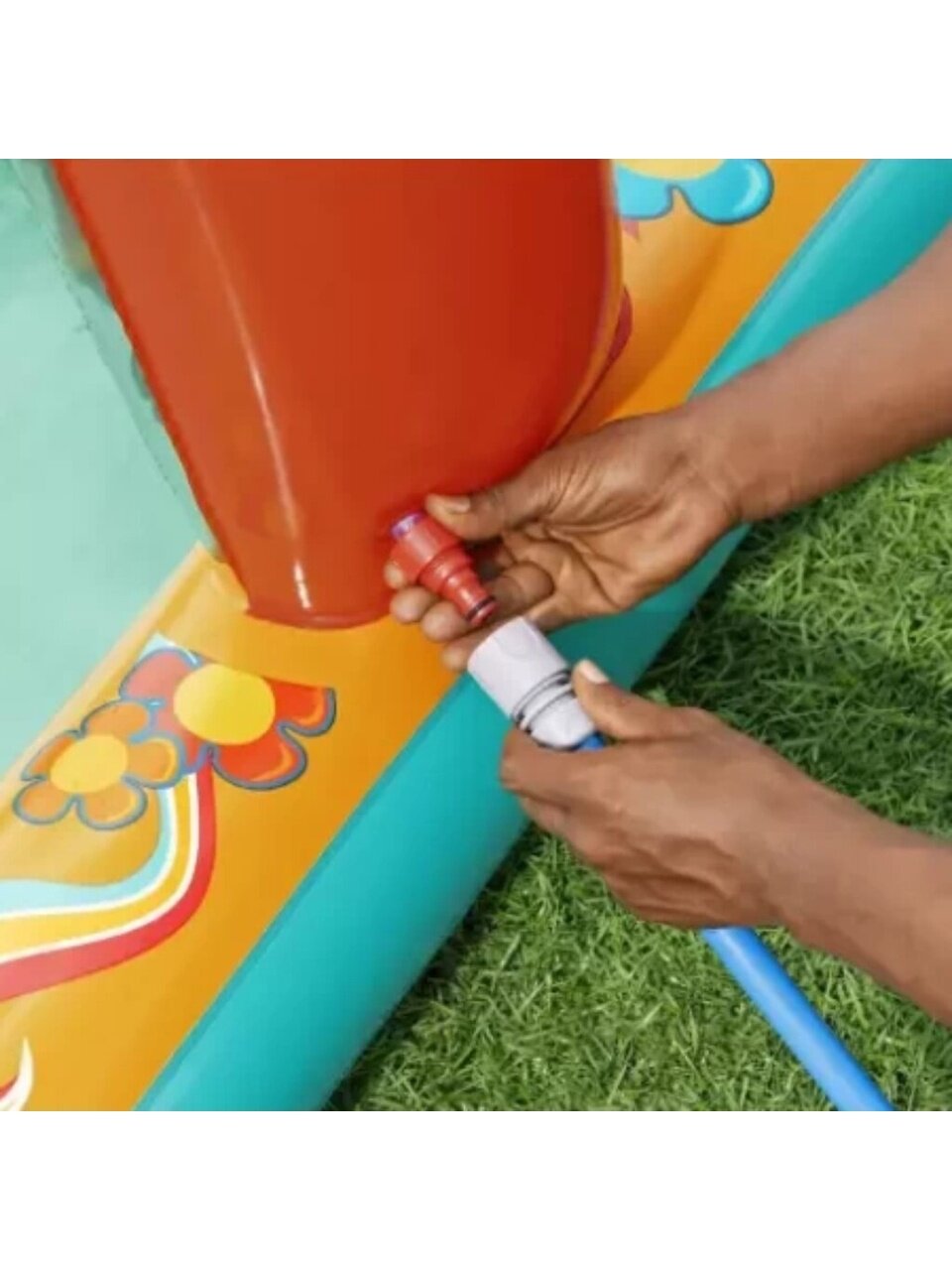 - встроенная водная горка и фонтанчик (разбрызгиватель), работающий от подачи воды из садового шланга, подарят еще больше удовольствия;