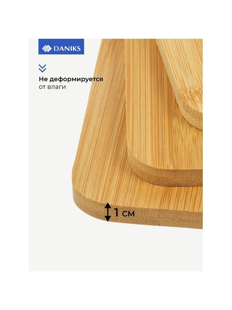Доски для разделки продуктов и подачи блюд – лучший инвентарь на каждой кухне. Набор состоит из трех деревянных бамбуковых досок разных размеров. Экологичные аксессуары выполнены из натурального бамбука. Разделочные доски большого и среднего размера подходят для приготовления, нарезки продуктов, теста, мяса, подачи горячих блюд. Аксессуар маленького размера идеален для сервировки и подачи овощей, фруктов, бутербродов.