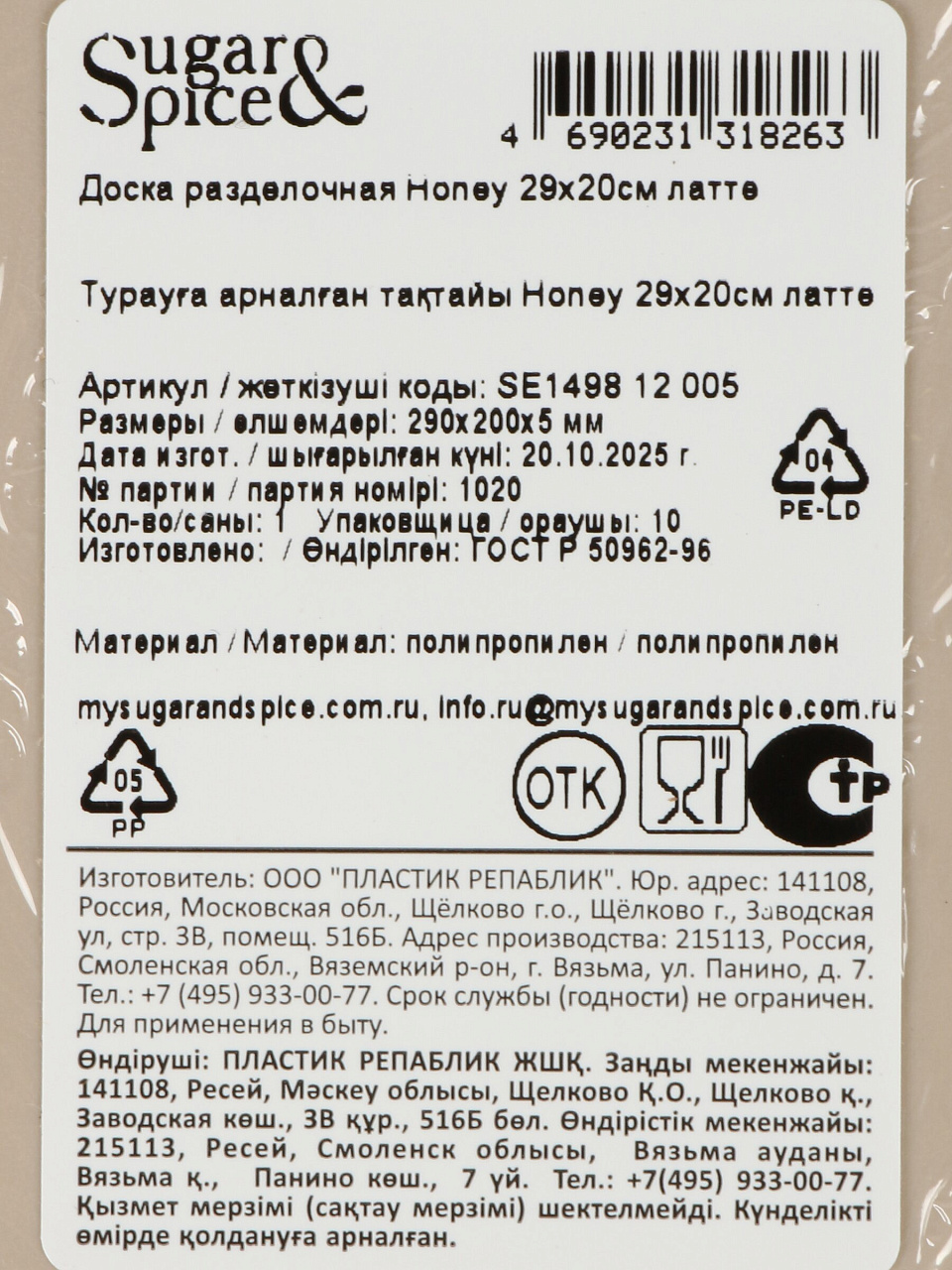 Вы можете приобрести «Доска разделочная пластик, 29х20х0.5 см, с ручкой, латте, прямоугольная, Sugar&Spice, Honey, SE149812005» и другие товары в нашем интернет-магазине в Тамбове по низким ценам и с бесплатным самовывозом.
