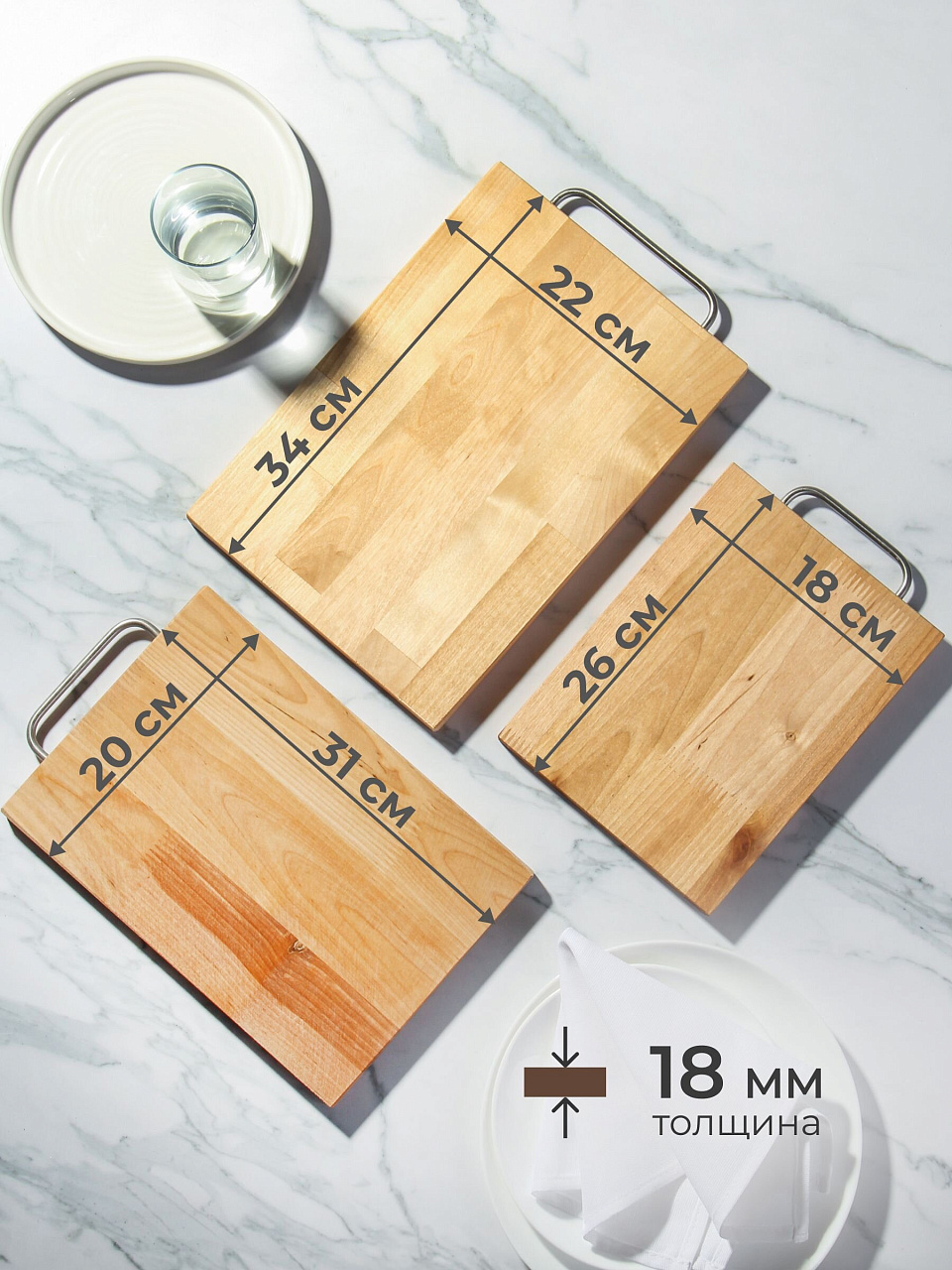 - Размеры с учетом ручек (ДхШхВ): большая доска: 34 х 22 х 1,8 см., средняя доска: 31 х 20х 1,8 см., маленькая доска: 26 х 18 х 1.8 см.
