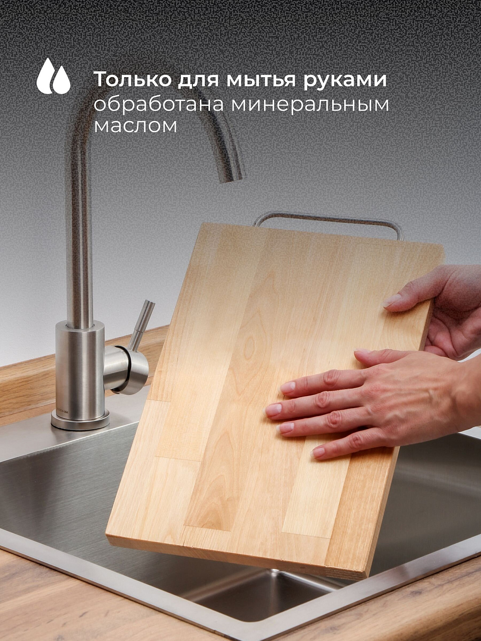 Доски обработаны вазелиновым маслом для предохранения от рассыхания. Нельзя мыть в посудомоечной машине, а также оставлять надолго погруженной в воду. При изготовлении досок используется водостойкий клей, который не теряет своих свойств при воздействии воды и безопасен для контакта с пищевыми продуктами.