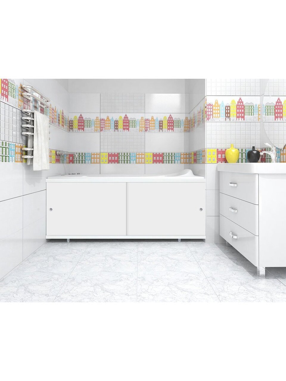 Экран под ванну выполняет в ванной комнате декоративную функцию, скрывая коммуникации под ванной, а также позволяет рационально использовать пространство, разместив за экраном все необходимое, например, бытовую химию.