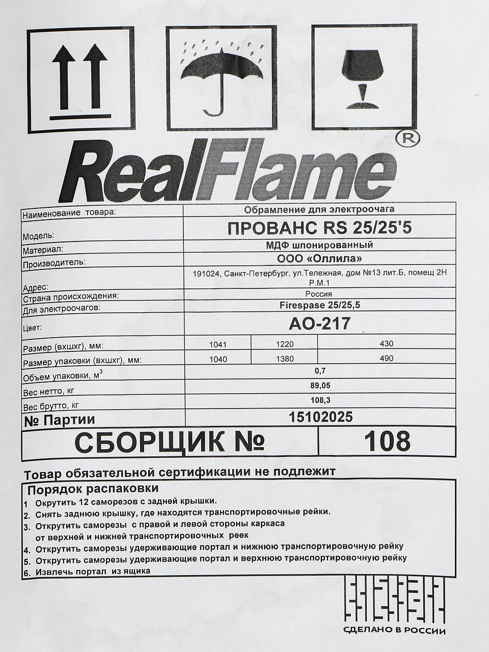 Ширина камина — 1200 мм, высота — 1025 мм, глубина подходит для стандартных помещений. Рекомендованная площадь обогрева — до 25 м², что оптимально для гостиной, спальни или кабинета.