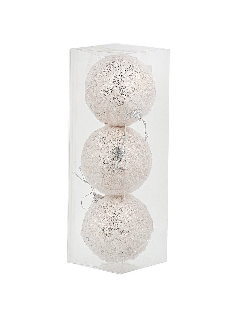 В наборе 3 однотонных белых шара диаметром 8 см. Они поставляются в прочной коробке для удобного хранения.