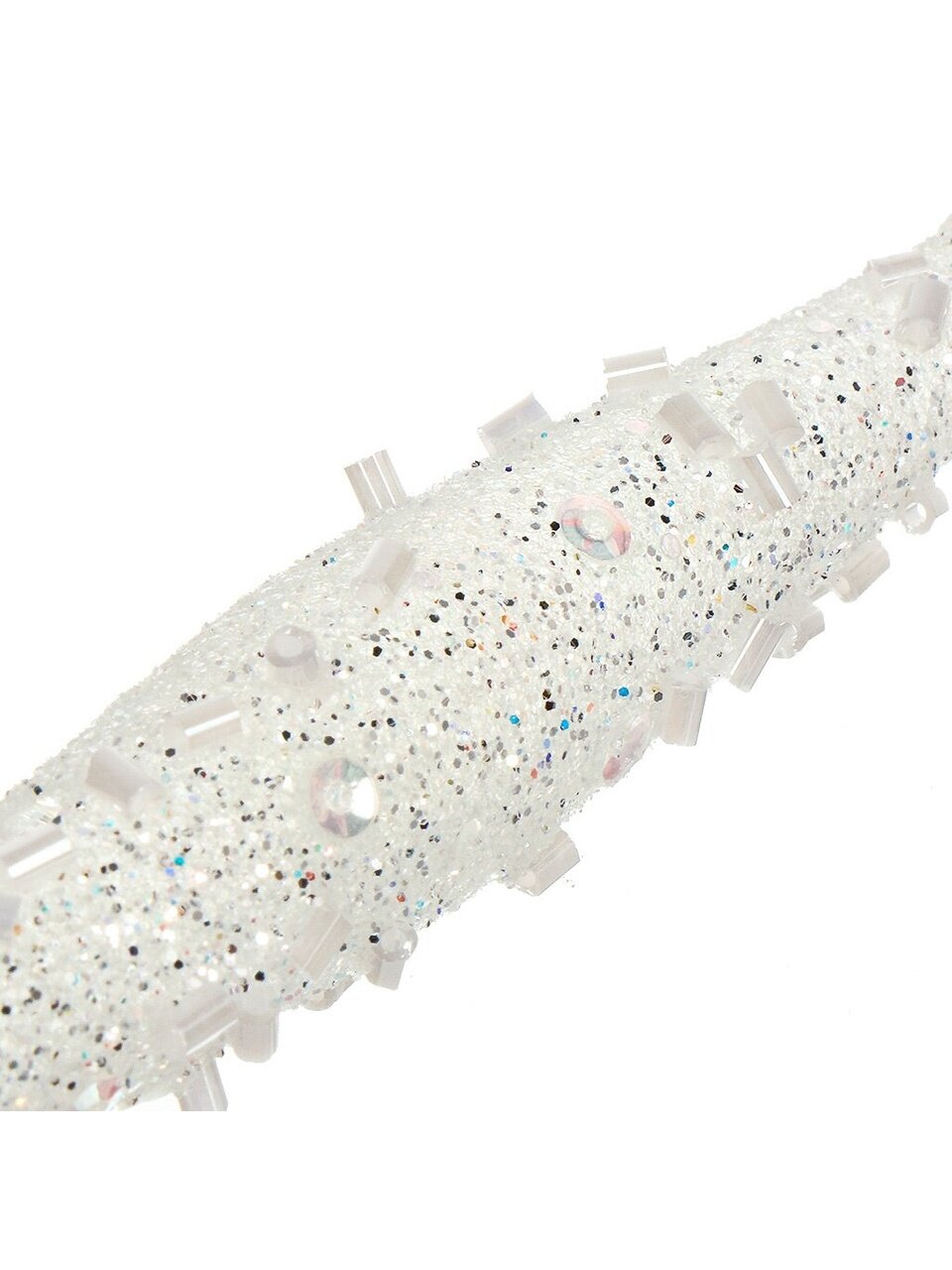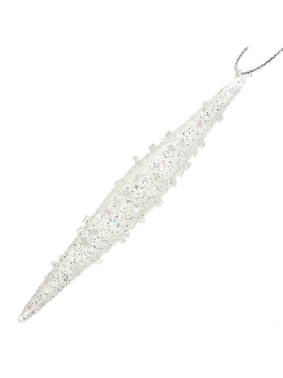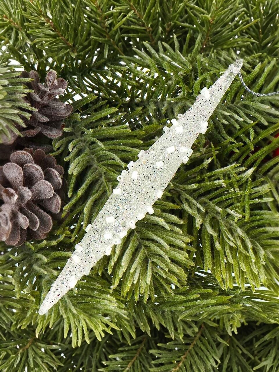 Длина украшения — 12 см, цвет — прозрачный (бесцветный), покрытие — блестящее, подходит для стандартных ёлок и композиций.