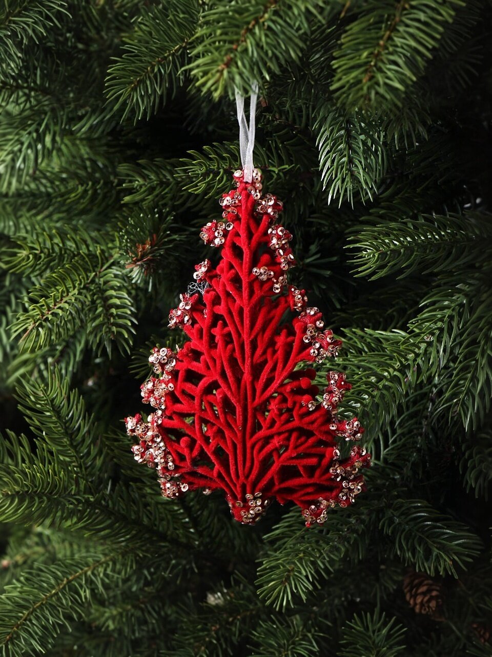 Украшение выполнено из прочного пластика с флоковым покрытием и блестками, не боится влаги и перепадов температуры — идеально для уличной елки.