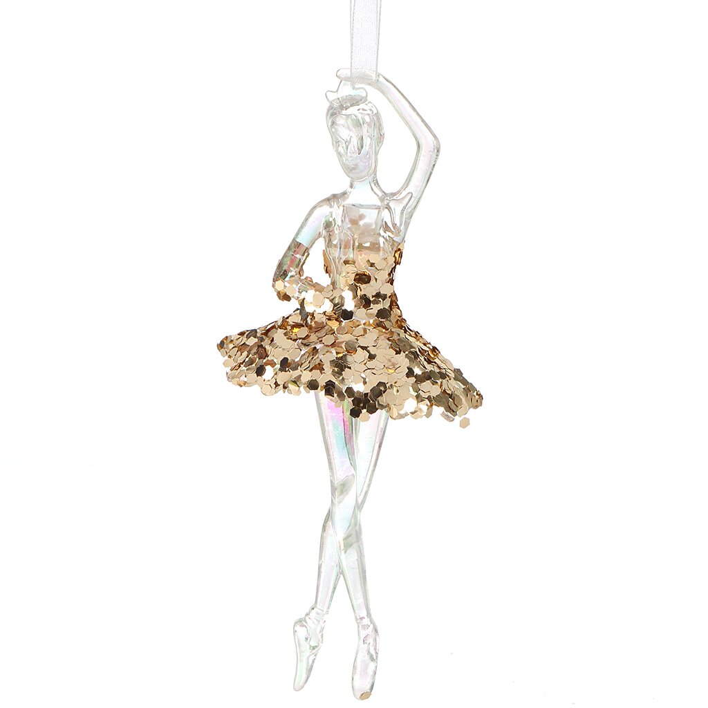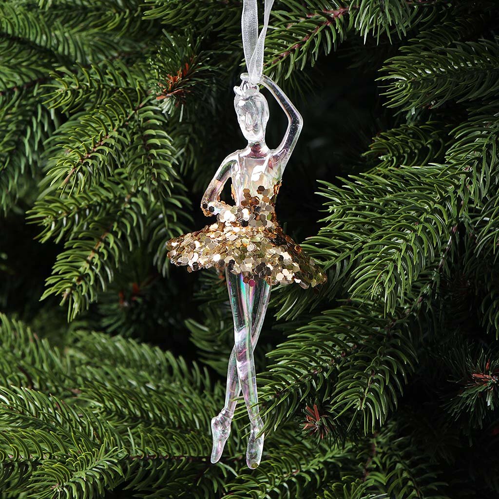 Элегантное елочное украшение «Балерина» 16 см: прозрачный пластик с золотым блеском, безопасно для детей и дачи, не бьётся, выгодно для стильного декора.