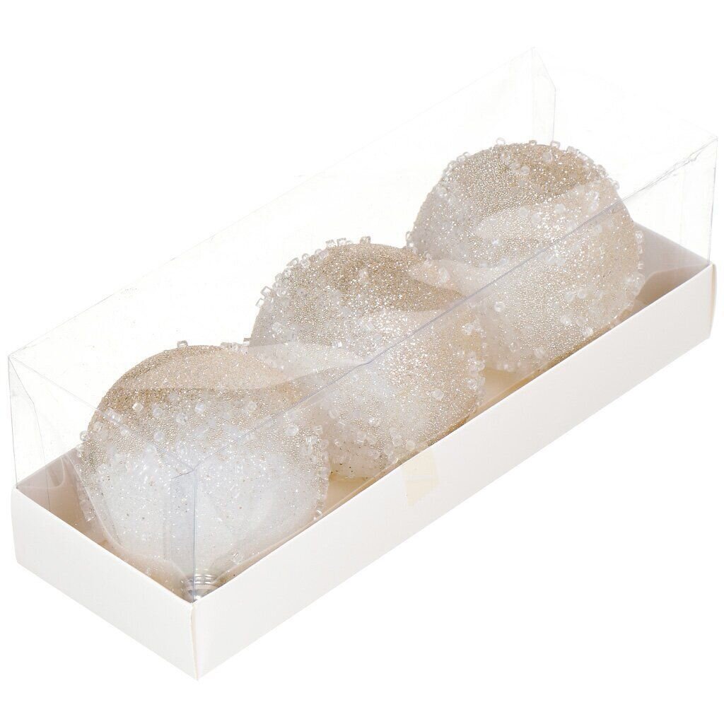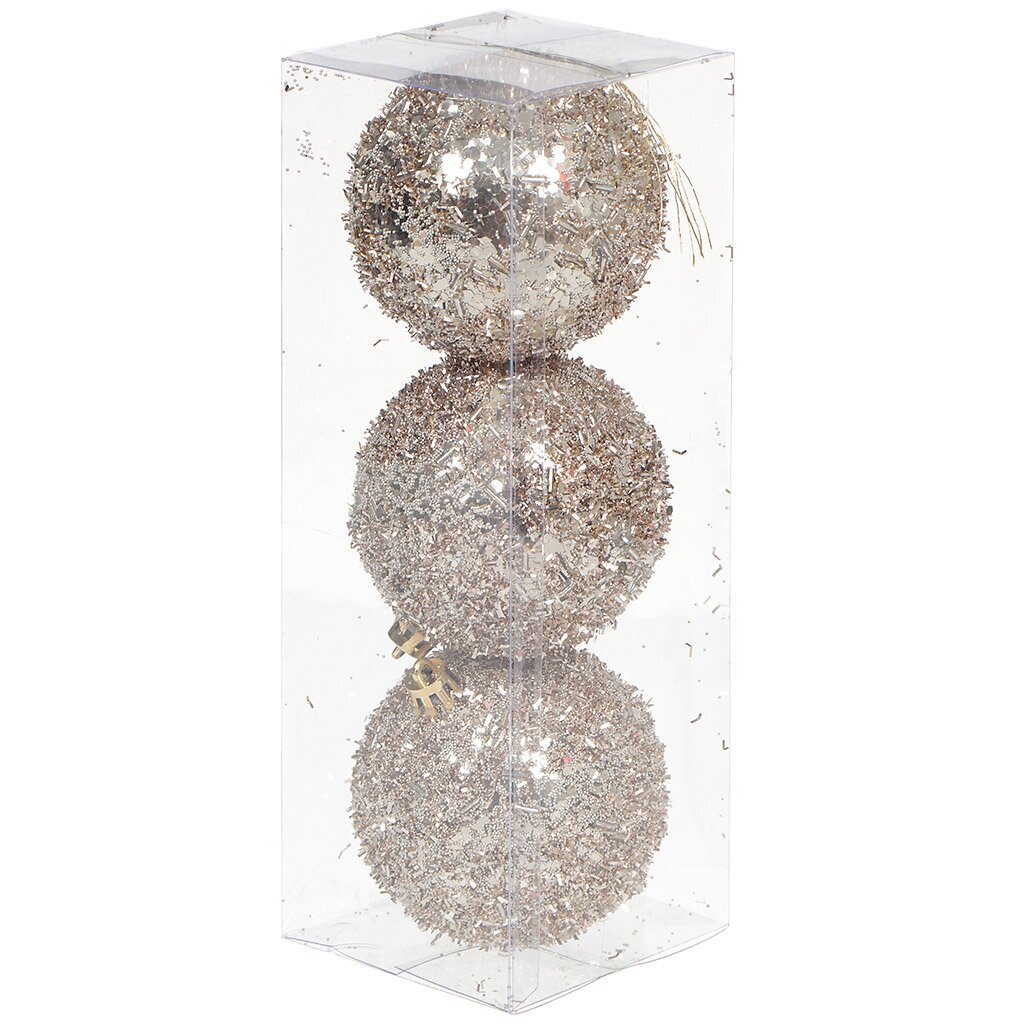 Диаметр каждого шара — 8 см, цвет — шампань (бежевый), покрытие с блестками, тип крепления — на подвеске, материал — пластик.