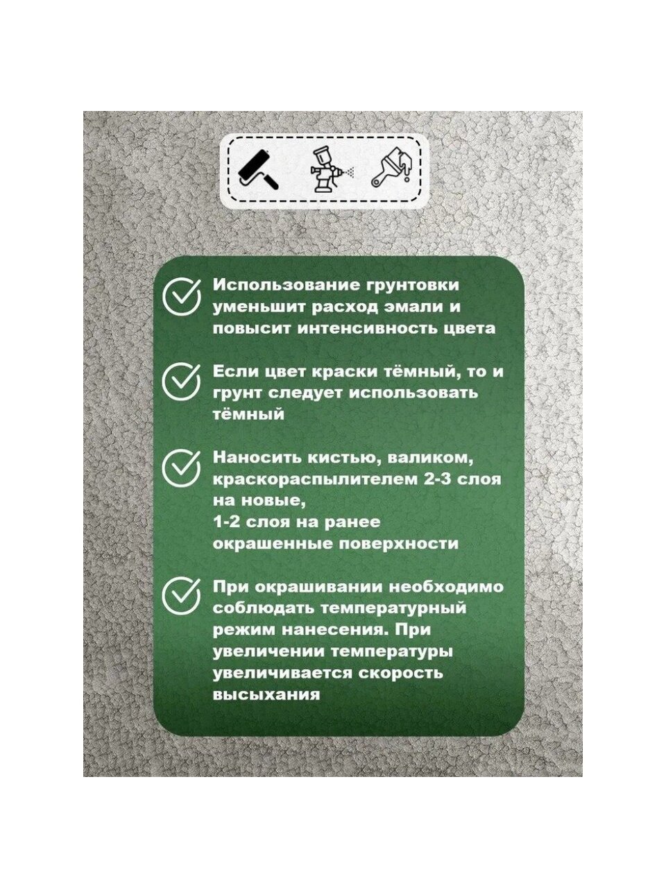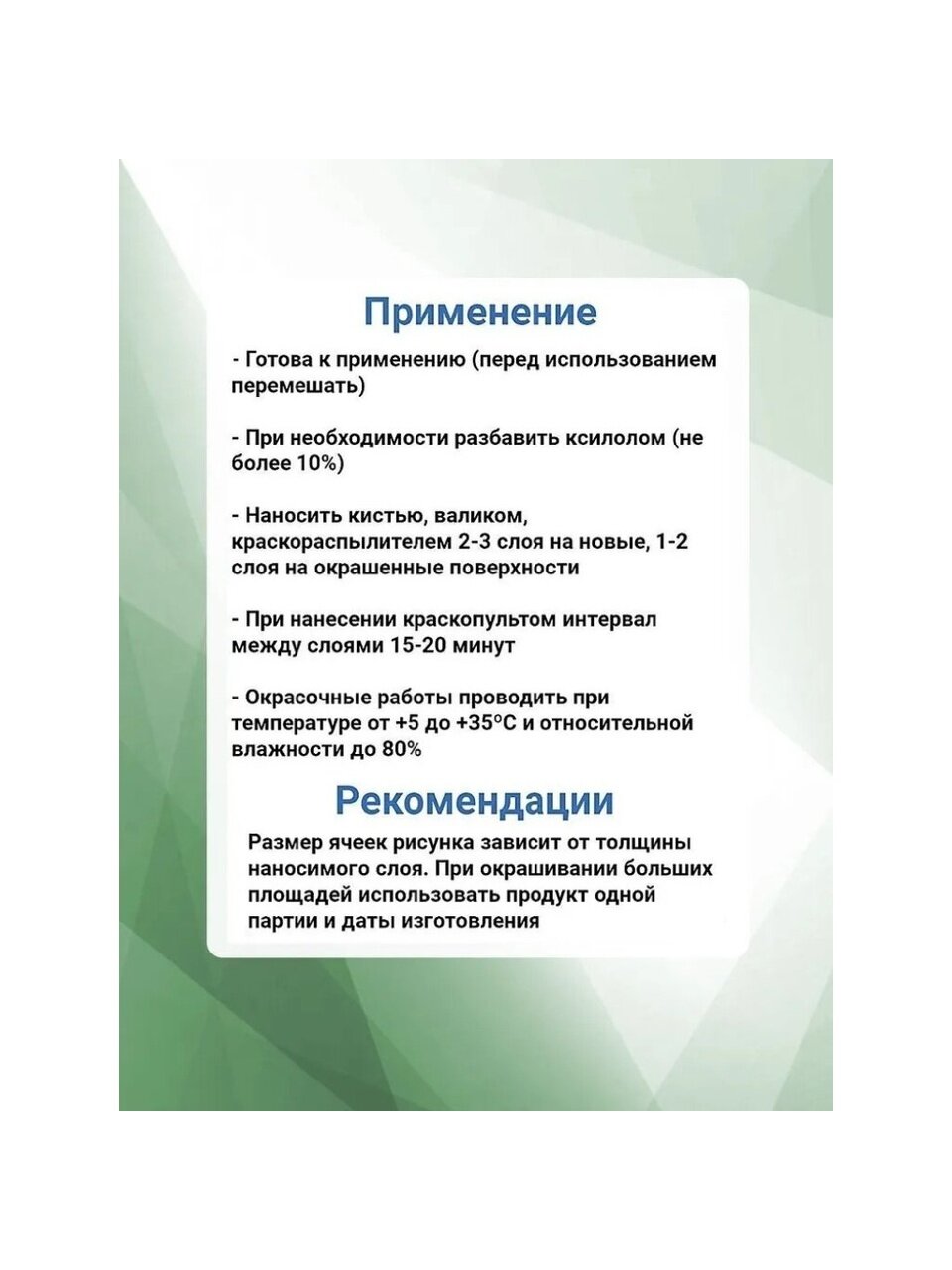Размер ячеек рисунка зависит от толщины наносимого слоя. При окрашивании больших площадей использовать продукт одной партии и даты изготовления.