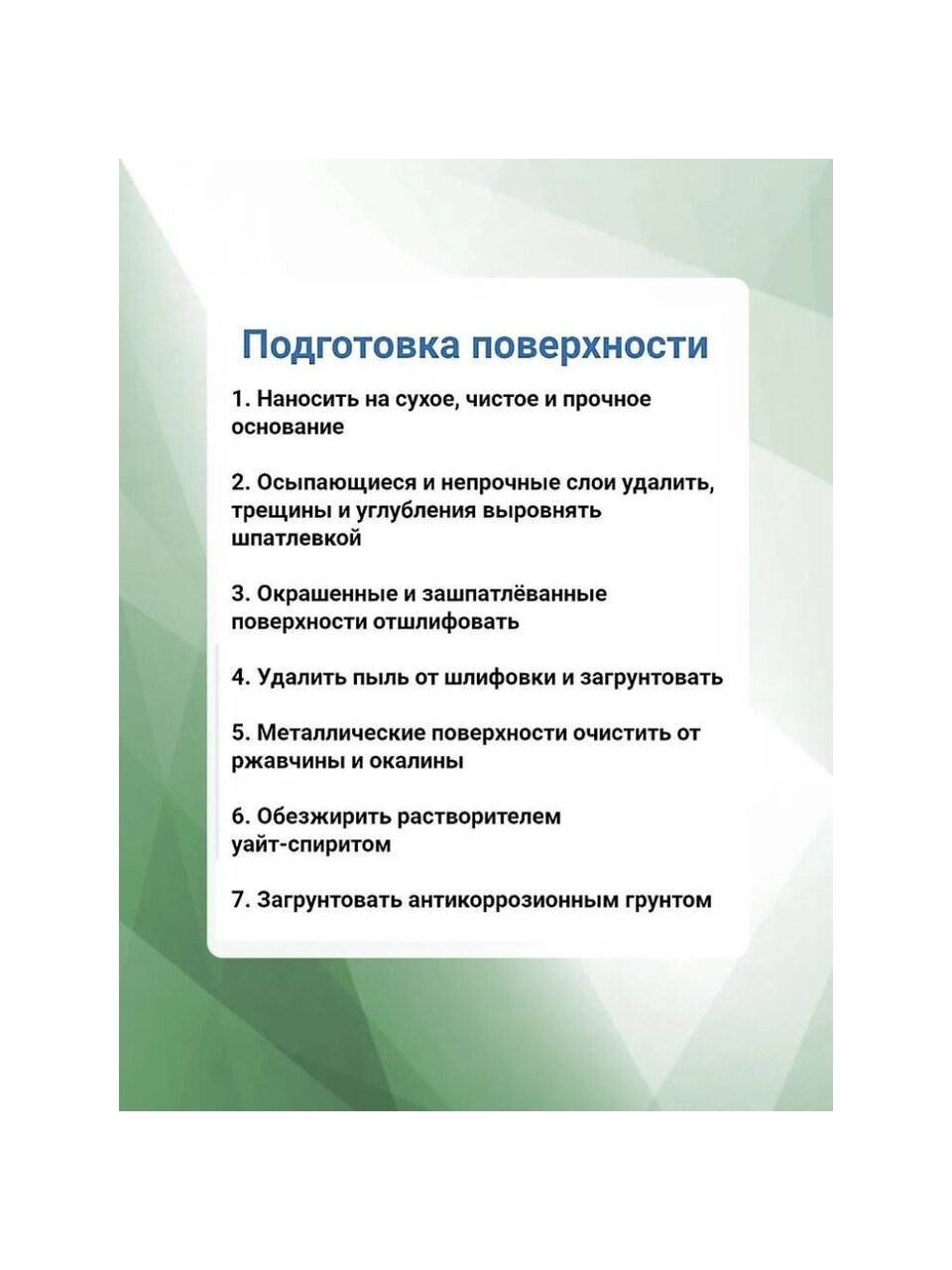 Наносить на сухое, чистое и прочное основание. Осыпающиеся и непрочные слои удалить, трещины и углубления выровнять шпатлёвкой. Окрашенные и зашпатлёванные поверхности отшлифовать, удалить пыль от шлифовки и загрунтовать. Металлические поверхности очистить от ржавчины и окалины, обезжирить растворителем уайт-спиритом, загрунтовать антикоррозионным грунтом.