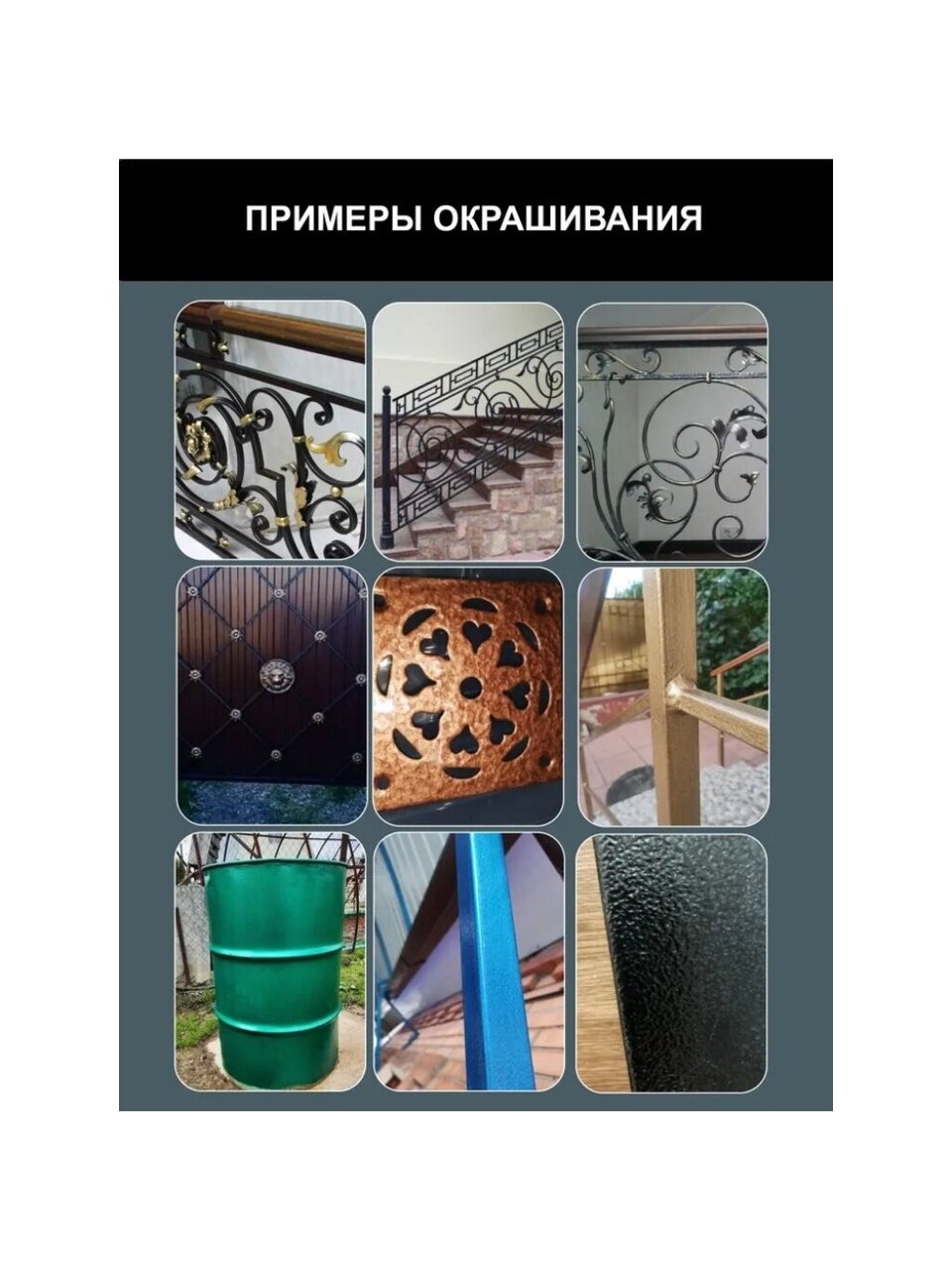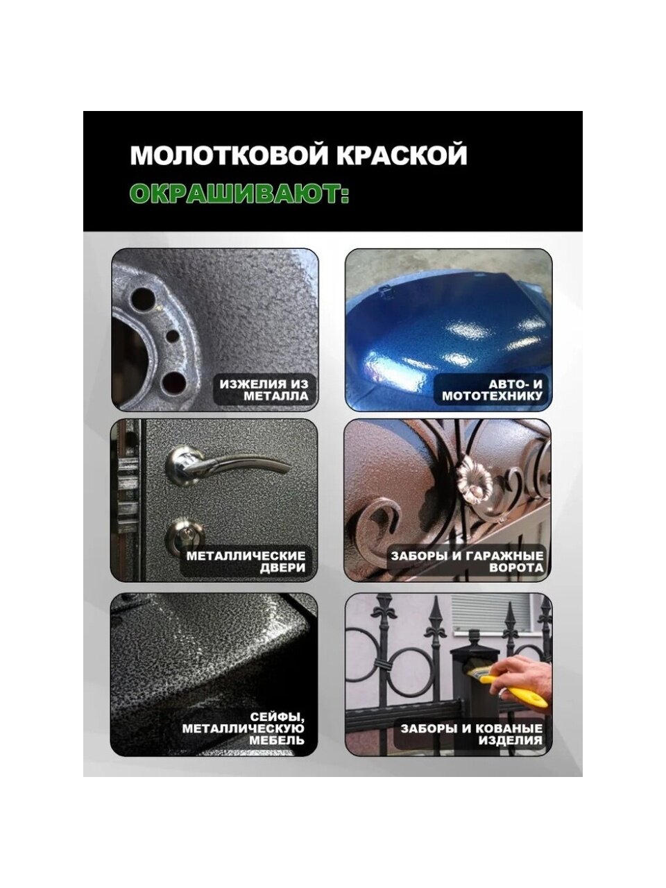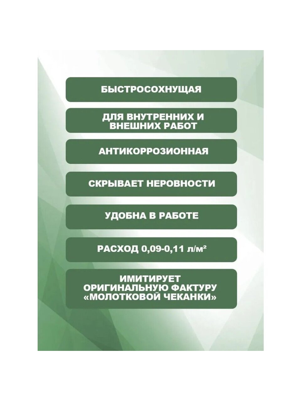 Окрашивание металлических, деревянных и других поверхностей. Для работ снаружи и внутри помещения. Защитно-декоративная пленка имитирует оригинальную фактуру «молотковой чеканки», скрывает мелкие неровности и огрехи основания. Легко наносится, хорошо растекается. Образует однородное покрытие, стойкое к мытью и истиранию, воздействию воды и растворов моющих средств. Обладает антикоррозионными свойствами. Атмосферостойкая. Быстросохнущая. Уникальные металлизированные цвета. Высоко укрывистая и экономичная. Выдерживает изменения температур от -50 до +60 ºС.