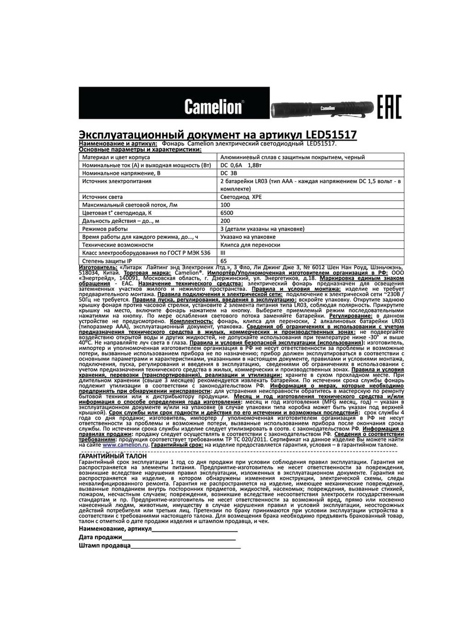 Фонарь Camelion LED51517 - высококачественный осветительный прибор ручного исполнения.