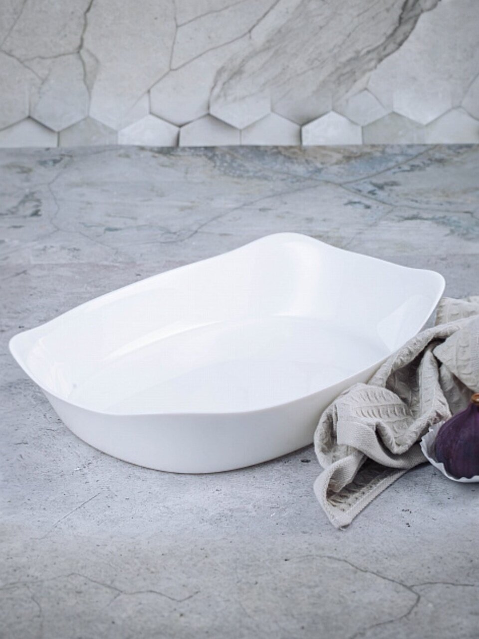 В отличие от металлических аналогов, стекло не вступает в реакцию с продуктами, не меняет вкус блюд и не царапается. Отсутствие антипригарного покрытия исключает риск выделения вредных веществ при высоких температурах. Часто спрашивают: подходит ли форма для посудомоечной машины и СВЧ? Да, изделие полностью совместимо с этими устройствами, а также подходит для хранения готовых блюд в холодильнике. Как использовать: просто выложите ингредиенты, запекайте, а затем подавайте прямо в форме — эстетика белого стекла подчеркнёт любое блюдо.