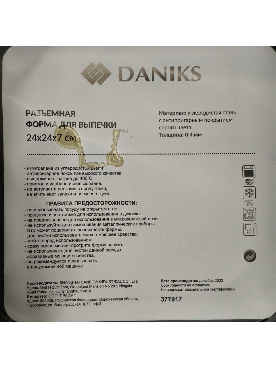 Квадратная разъемная форма для запекания Daniks 24x24 см — идеальный выбор для пирогов и тортов без прилипания и хлопот с мытьём.