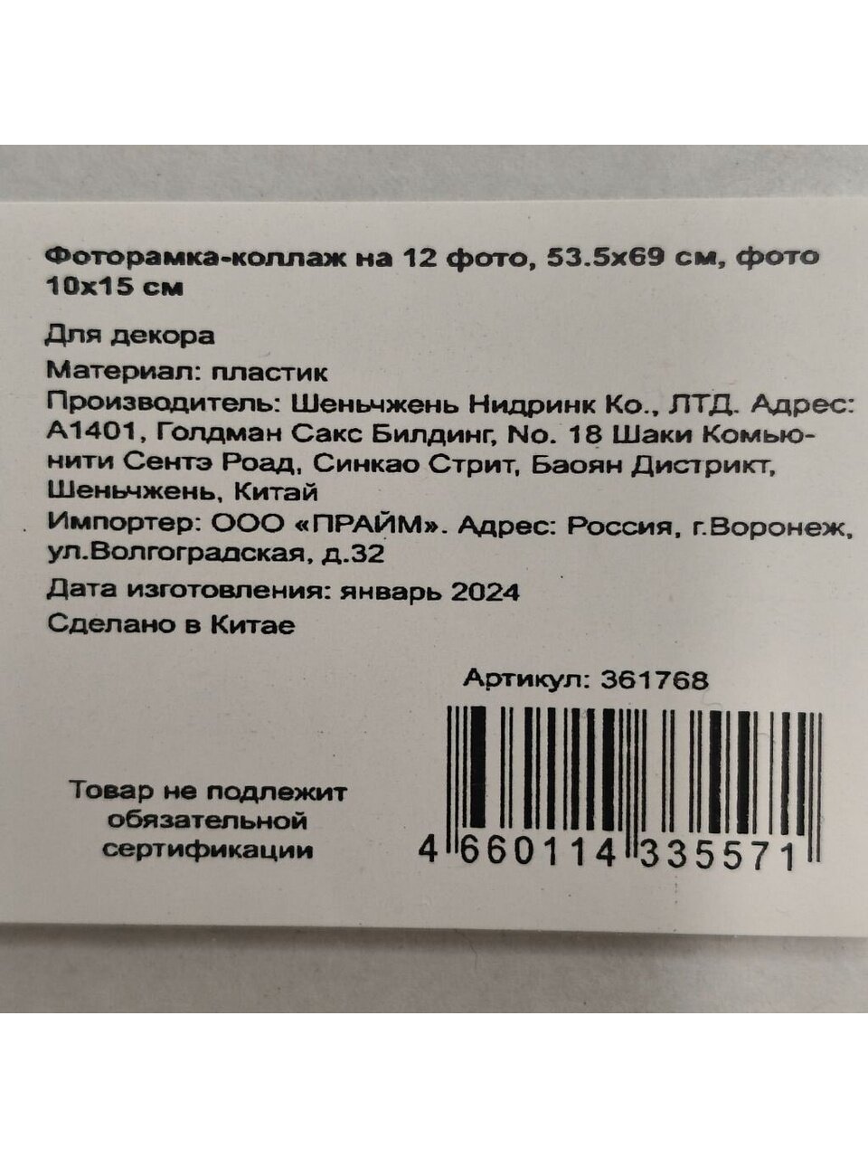 Вы можете приобрести «Фоторамка-коллаж на 12 фото, 53.5х69 см, фото 10х15 см, пластик, Y4-3881» и другие товары в нашем интернет-магазине в Обнинске по низким ценам и с бесплатным самовывозом.