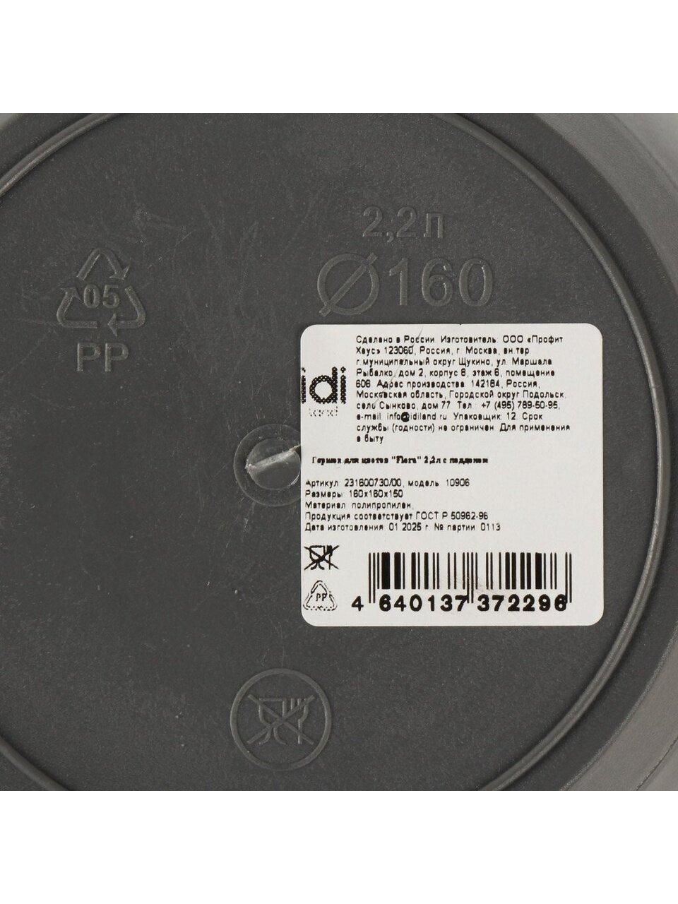 Стильный пластиковый горшок для цветов 2.2 л с поддоном Idiland Flora станет отличным решением для украшения интерьера. Современный дизайн, компактный размер 15 см и универсальный черный цвет гармонируют с любым стилем. Идеально подходит для комнатных растений, легко впишется в дом или на дачу.