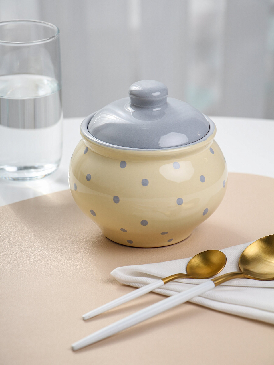 Диаметр — 13 см, высота — 12 см, форма круглая. Крышка в комплекте, материал — натуральная керамика.