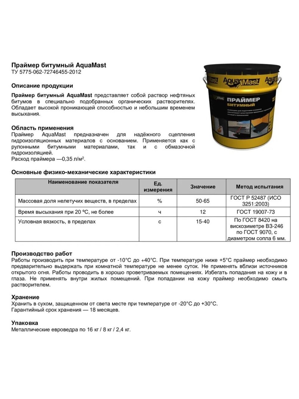 Область применения: Праймер AquaMast предназначен для надёжного сцепления гидроизоляционных материалов с основанием. Применяется как с рулонными битумными материалами, так и с обмазочной гидроизоляцией. Расход праймера —0,35 л/м2