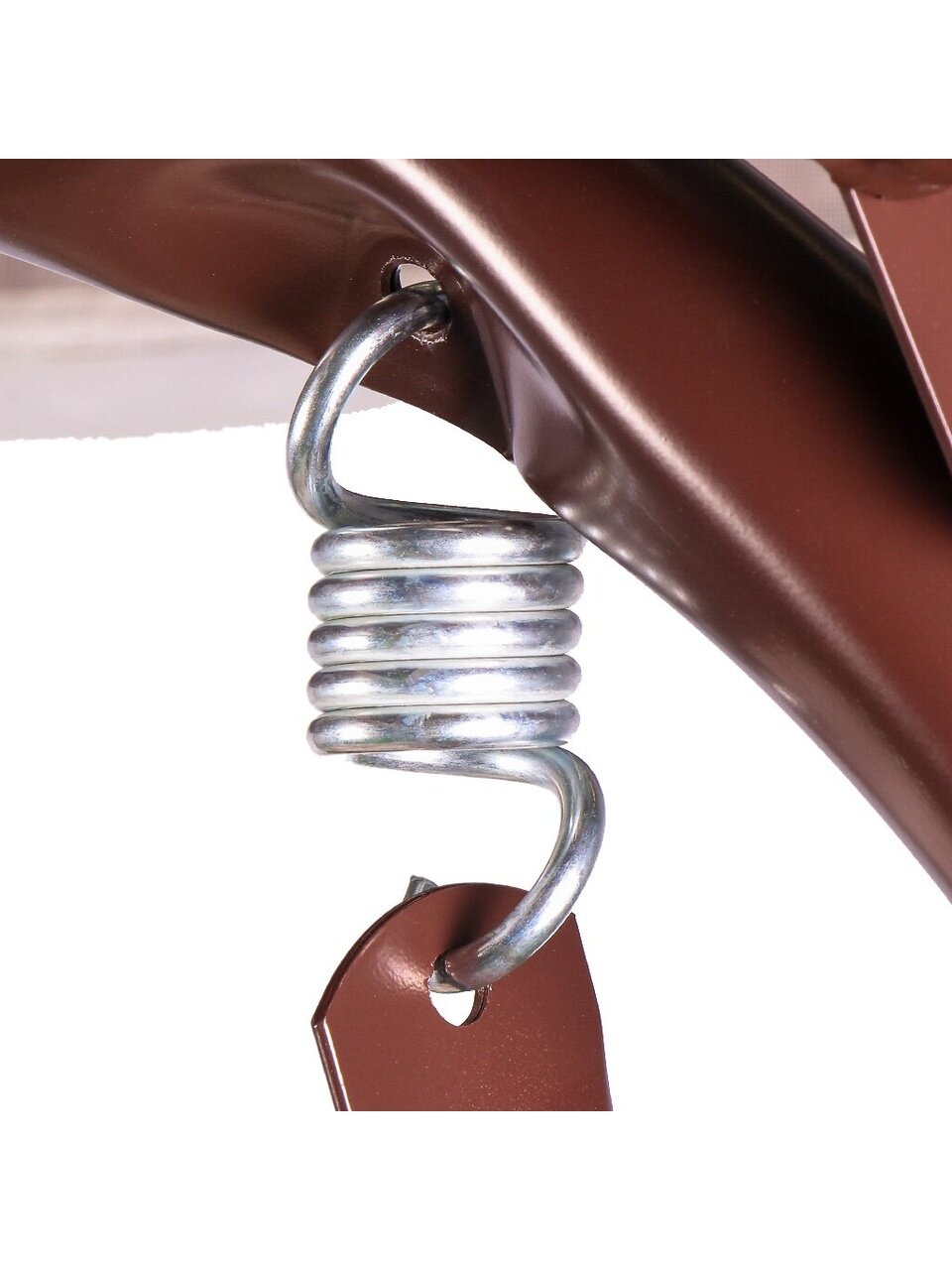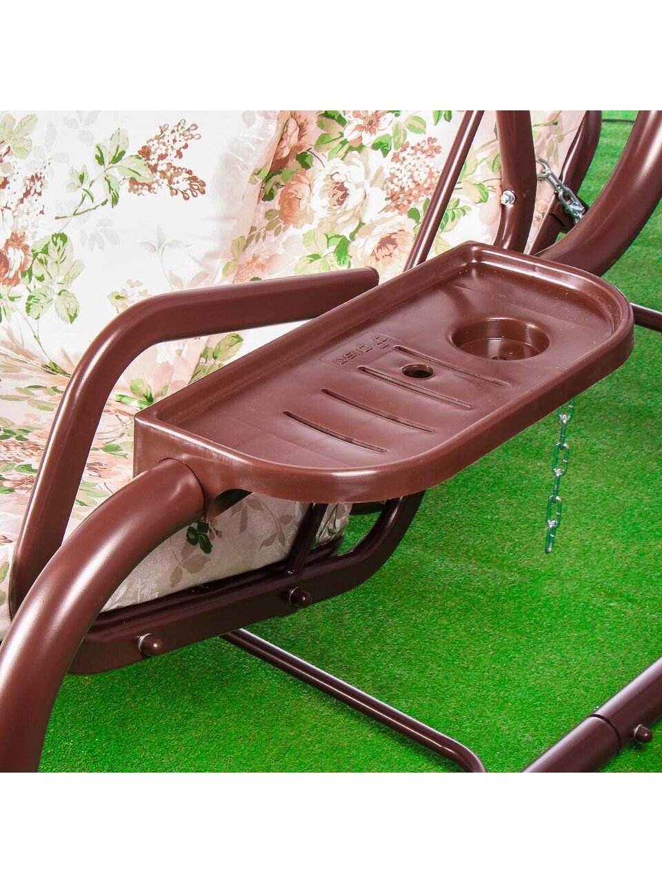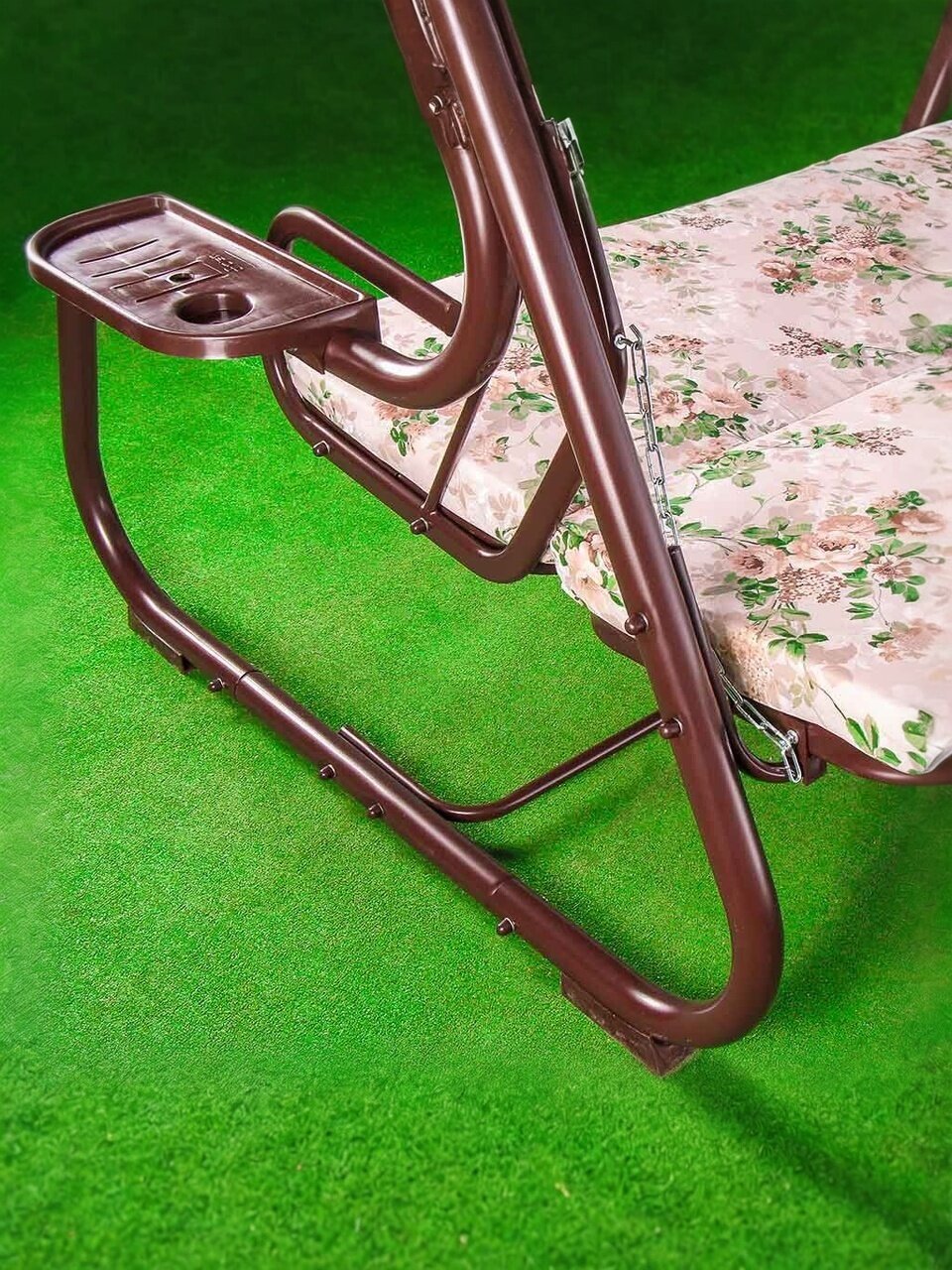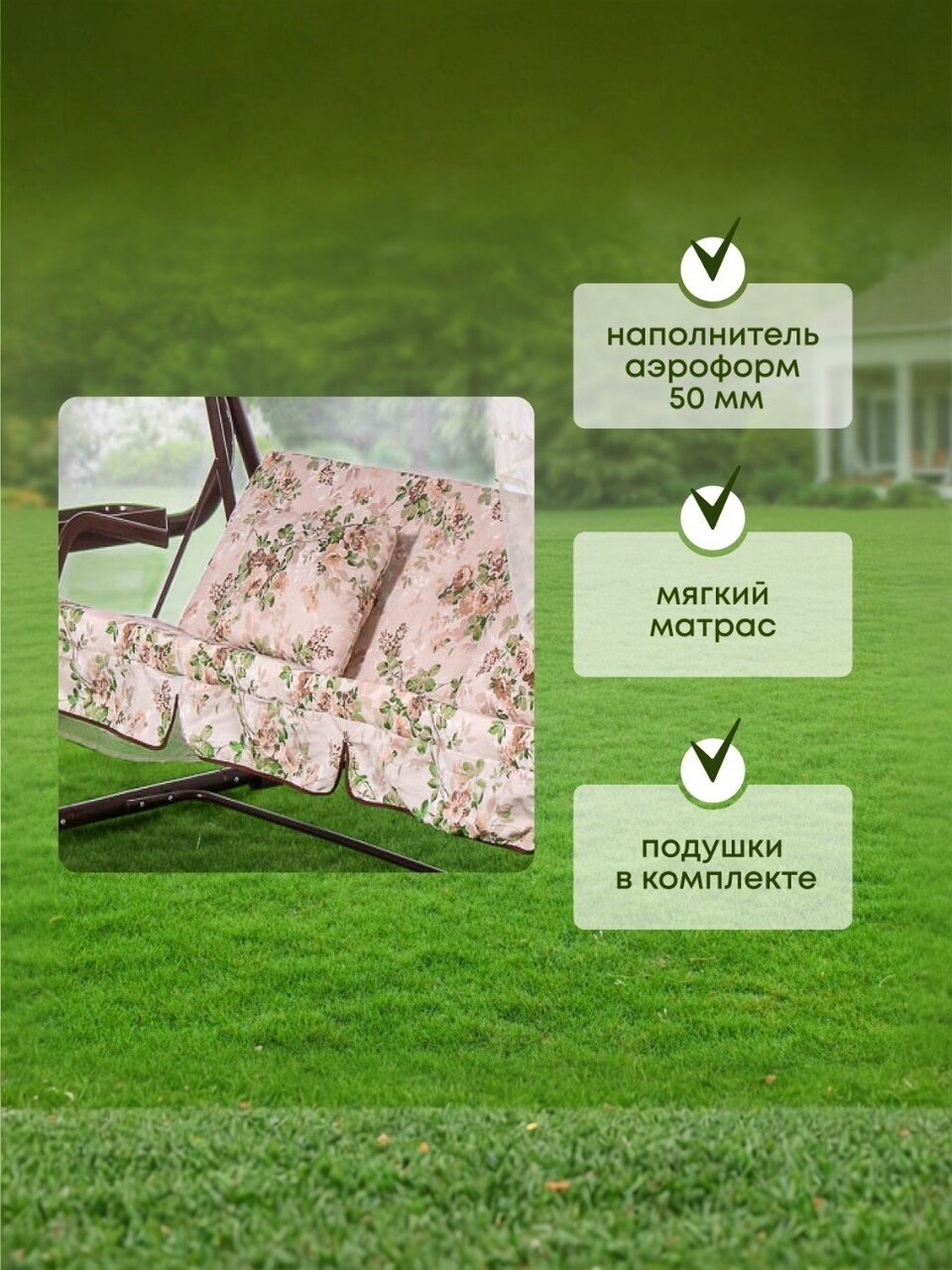 Качели оснащены мягким сиденьем и спинкой с наполнителем из аэрофома, а подушки наполнены синтепоном, что обеспечивает комфорт на протяжении всего времени использования. Размеры сиденья и спинки (178х53 см) позволяют удобно разместиться трем взрослым. Тент из плотной ткани (130 г/м²) надежно защищает от солнечных лучей, а дугообразная форма опоры придает конструкции устойчивость и современный вид.