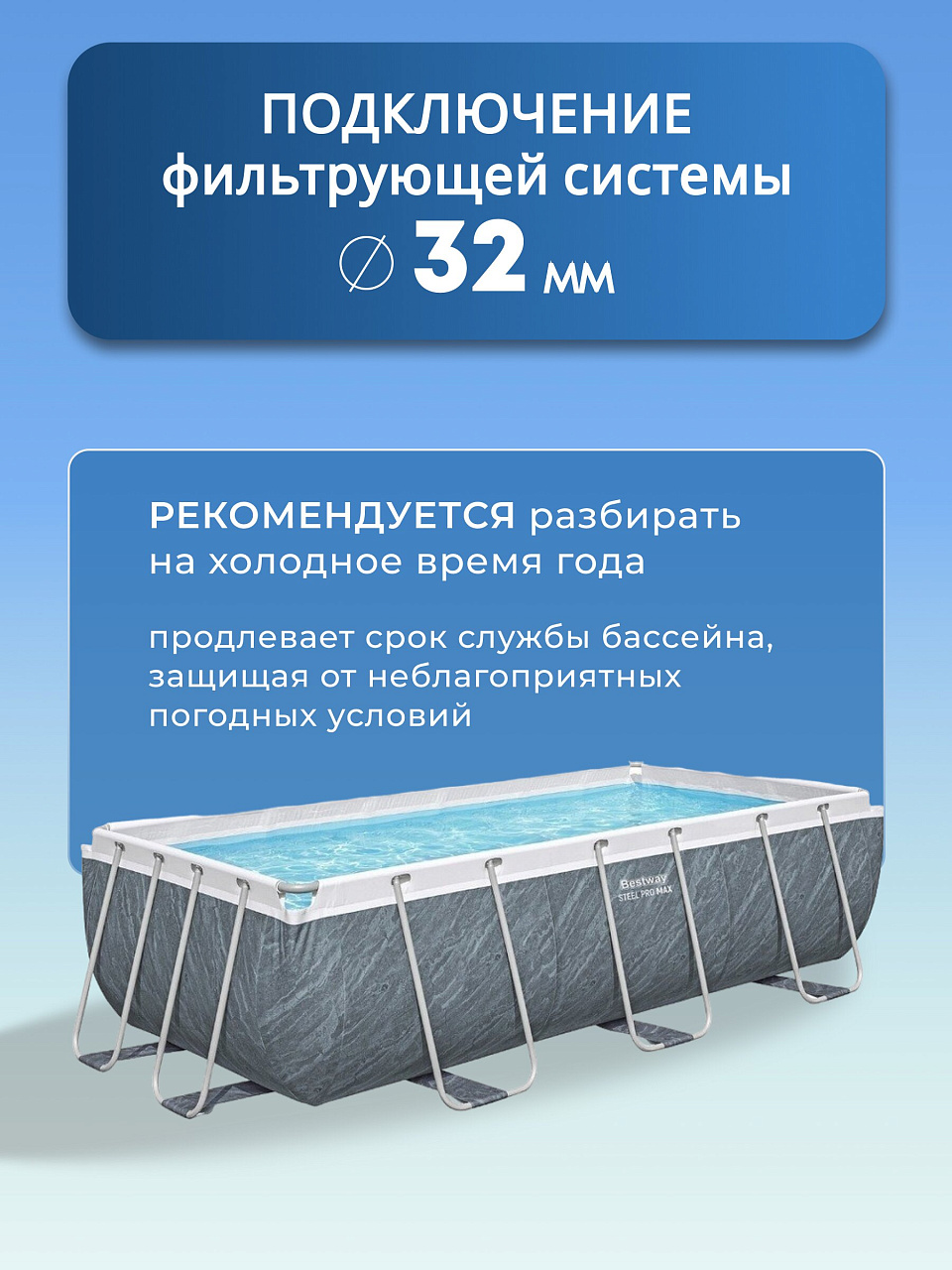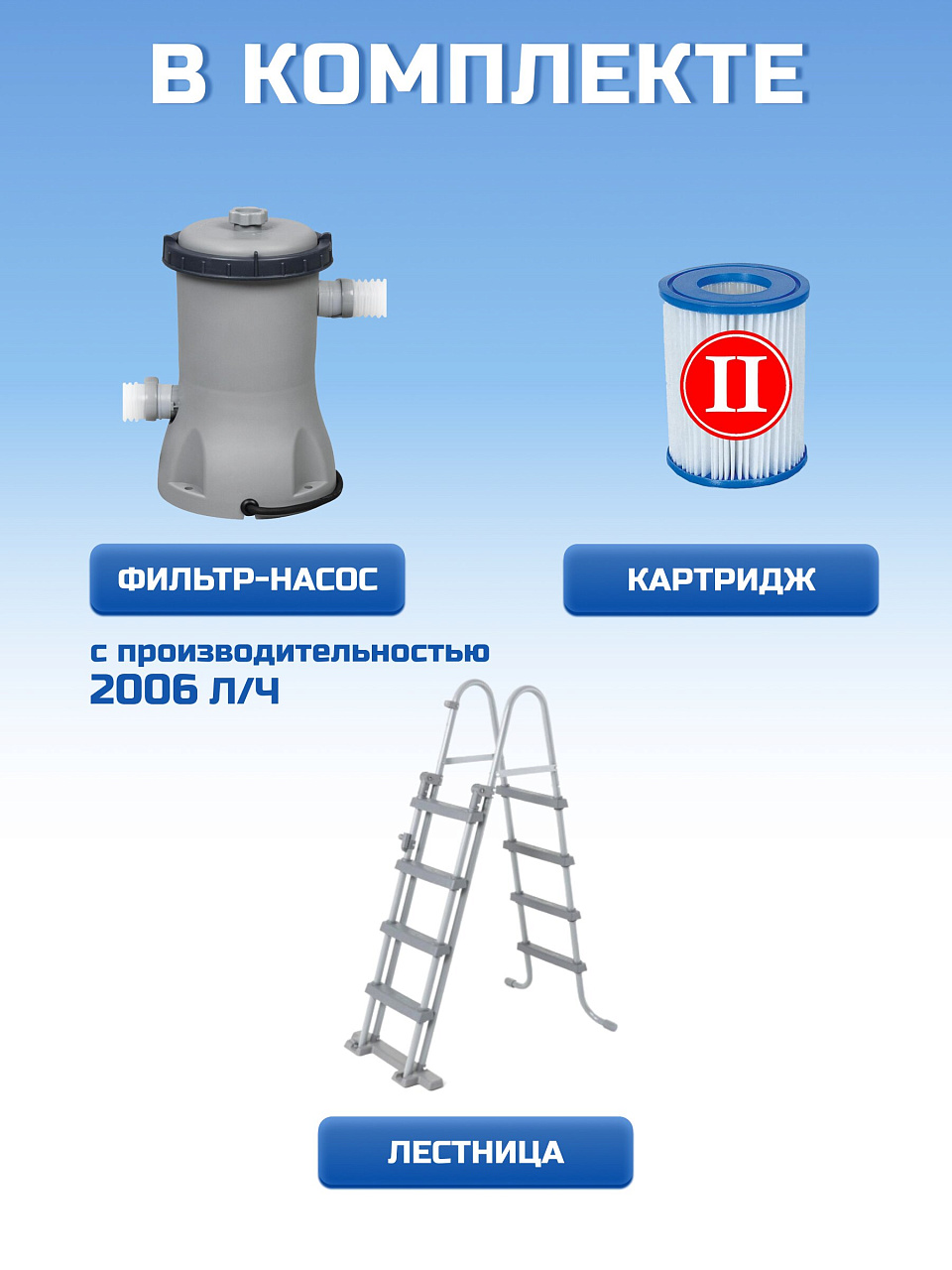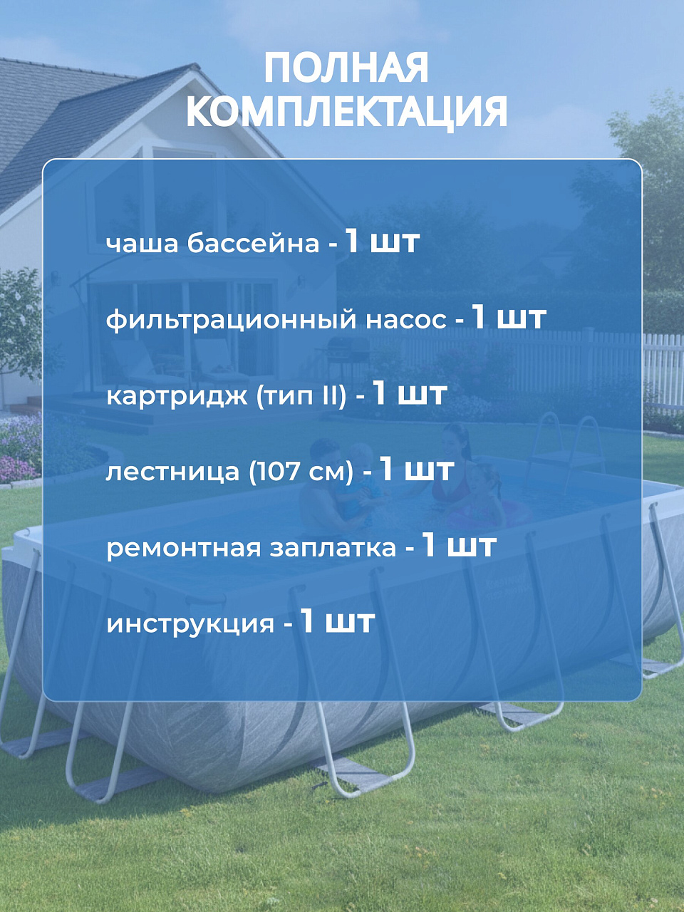 - Удобство использования: в комплекте идет лестница высотой 107 см, рассчитанная на нагрузку до 150 кг, что делает вход и выход из бассейна безопасным и комфортным.