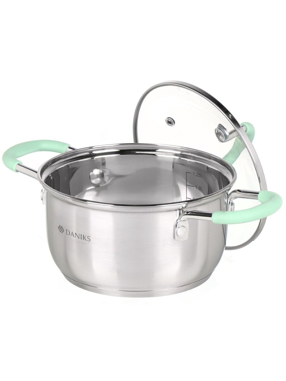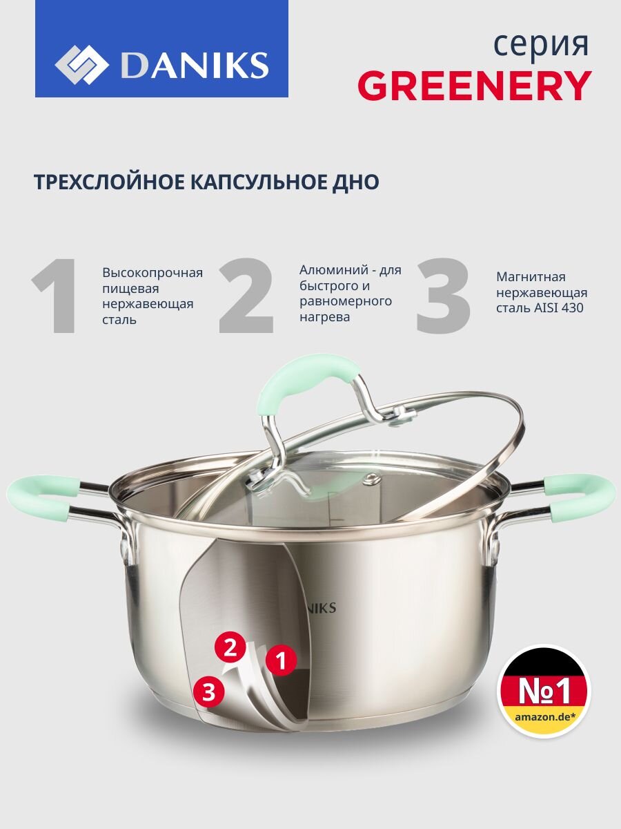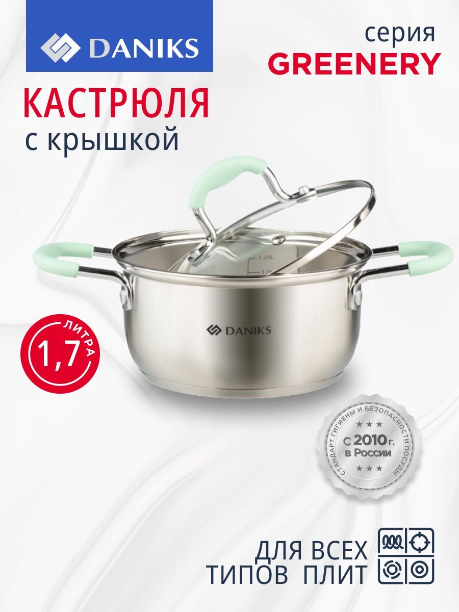 Кастрюля Daniks Гринери 1.7 л: нержавеющая сталь, стеклянная крышка с выпускным клапаном, силиконовые ручки — оптимальный выбор для индукции и дома.
