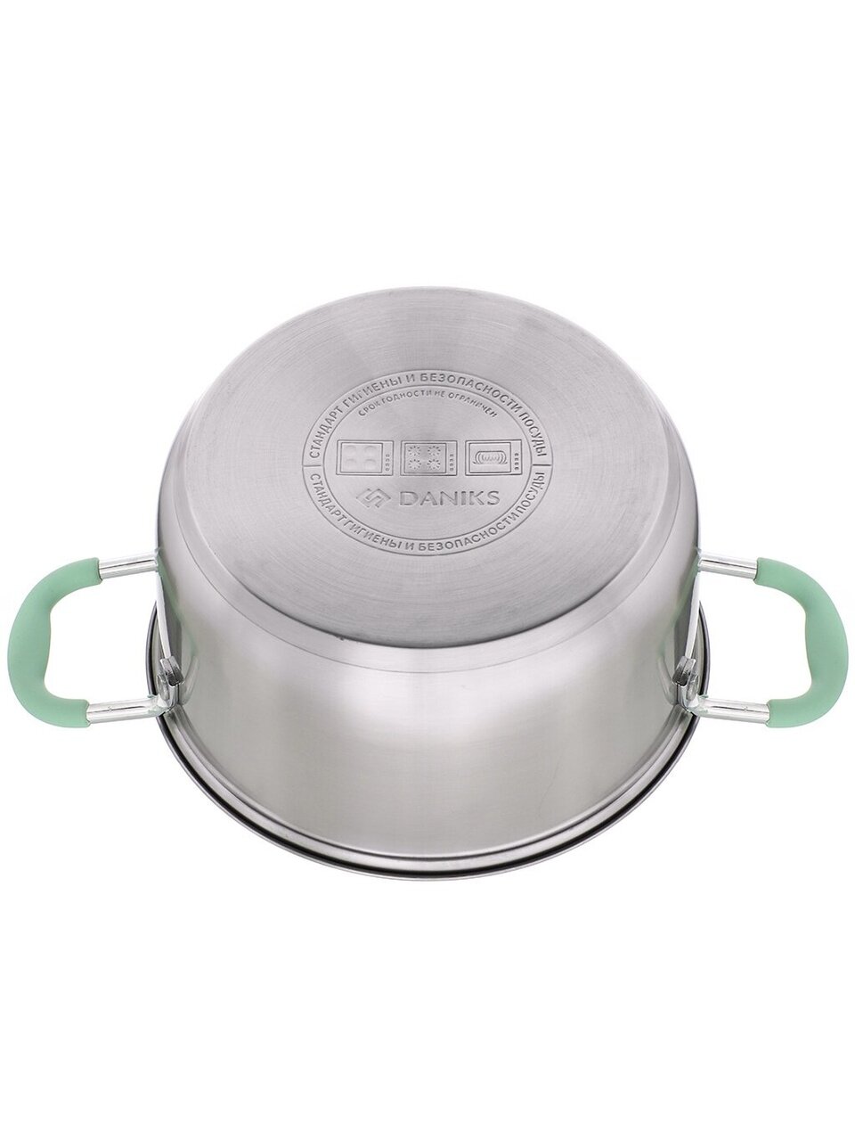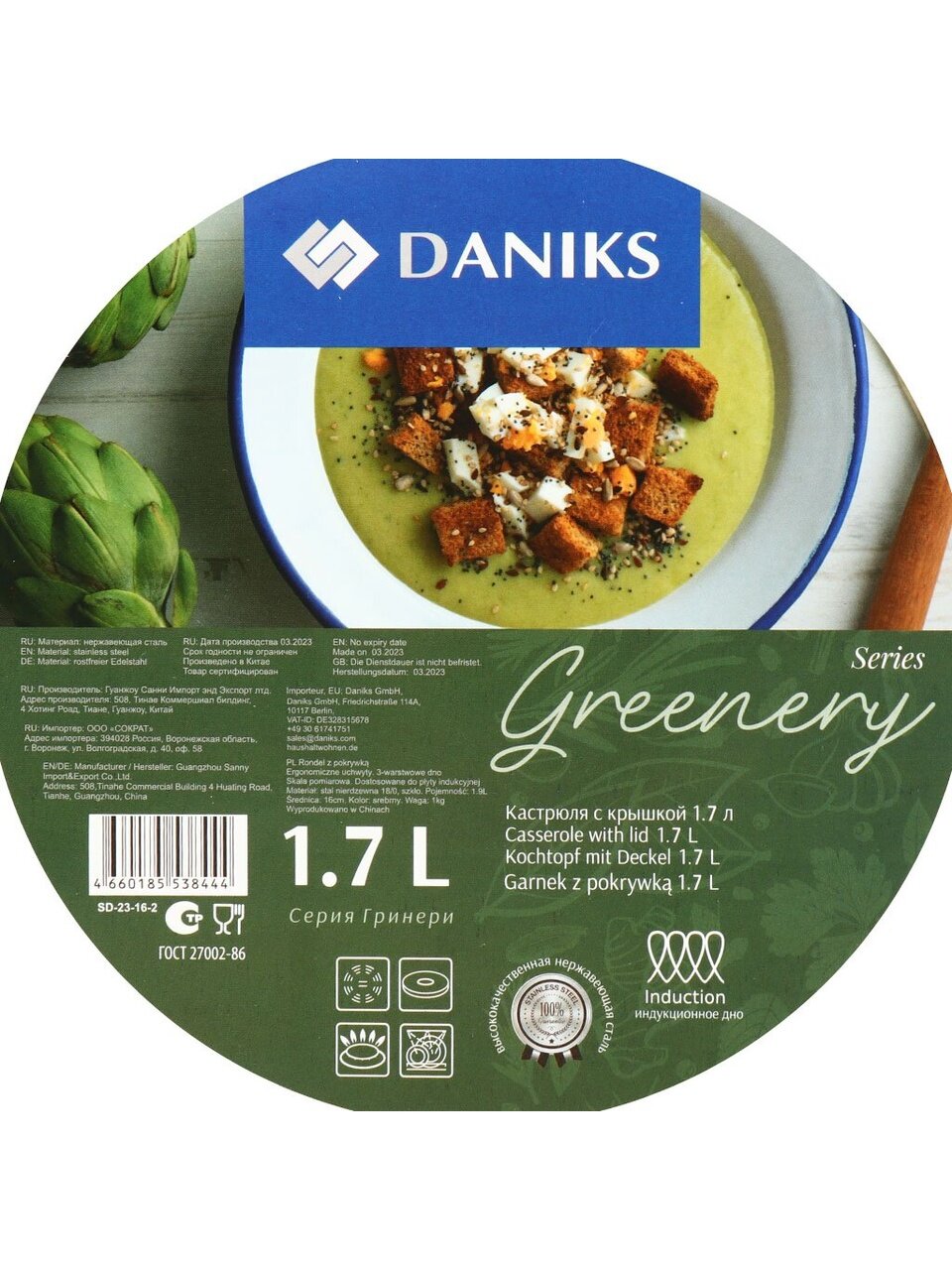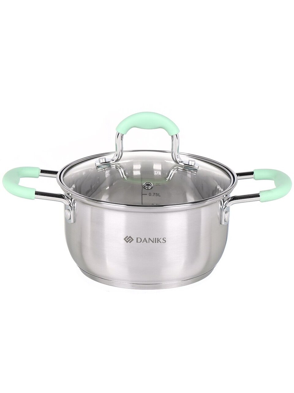 Кастрюля Daniks Гринери 1.7 л: нержавеющая сталь, стеклянная крышка с выпускным клапаном, силиконовые ручки — оптимальный выбор для индукции и дома.