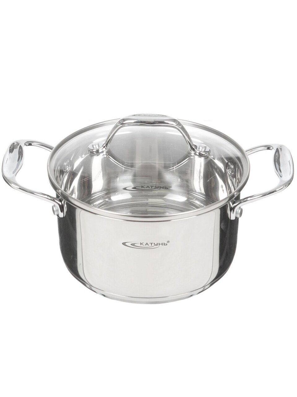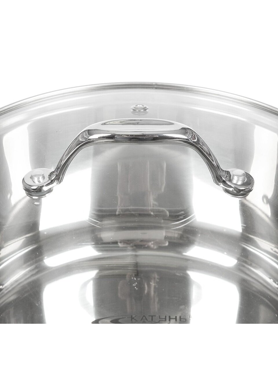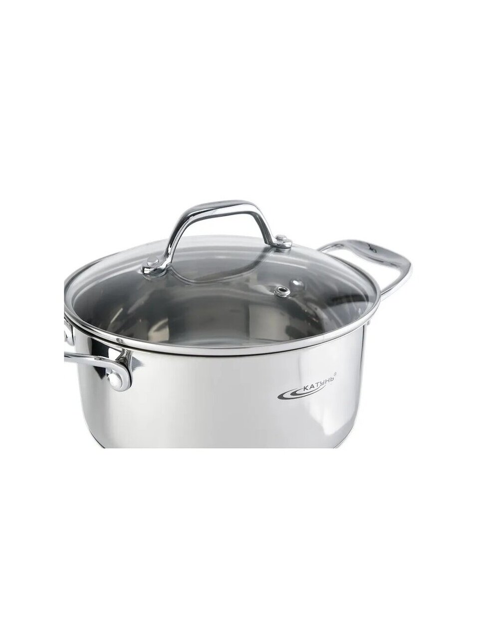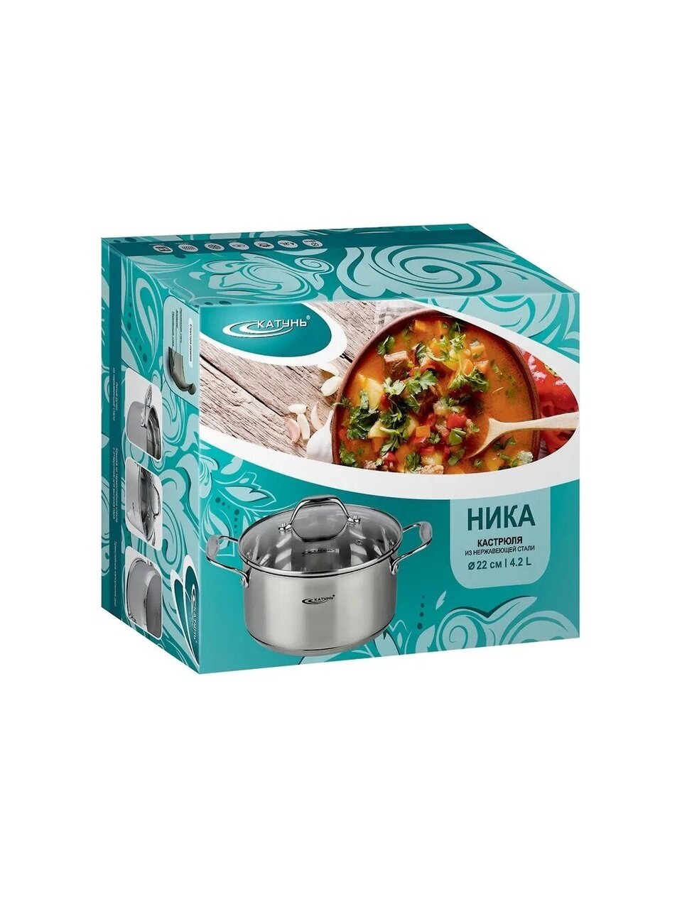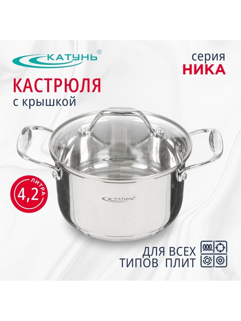 Кастрюля из нержавеющей стали 4,2 л Катунь Ника: оптимальный выбор для дома и дачи, подходит для индукции, газовых и электрических плит. Прочный корпус, стеклянная крышка с клапаном, выгодная цена.