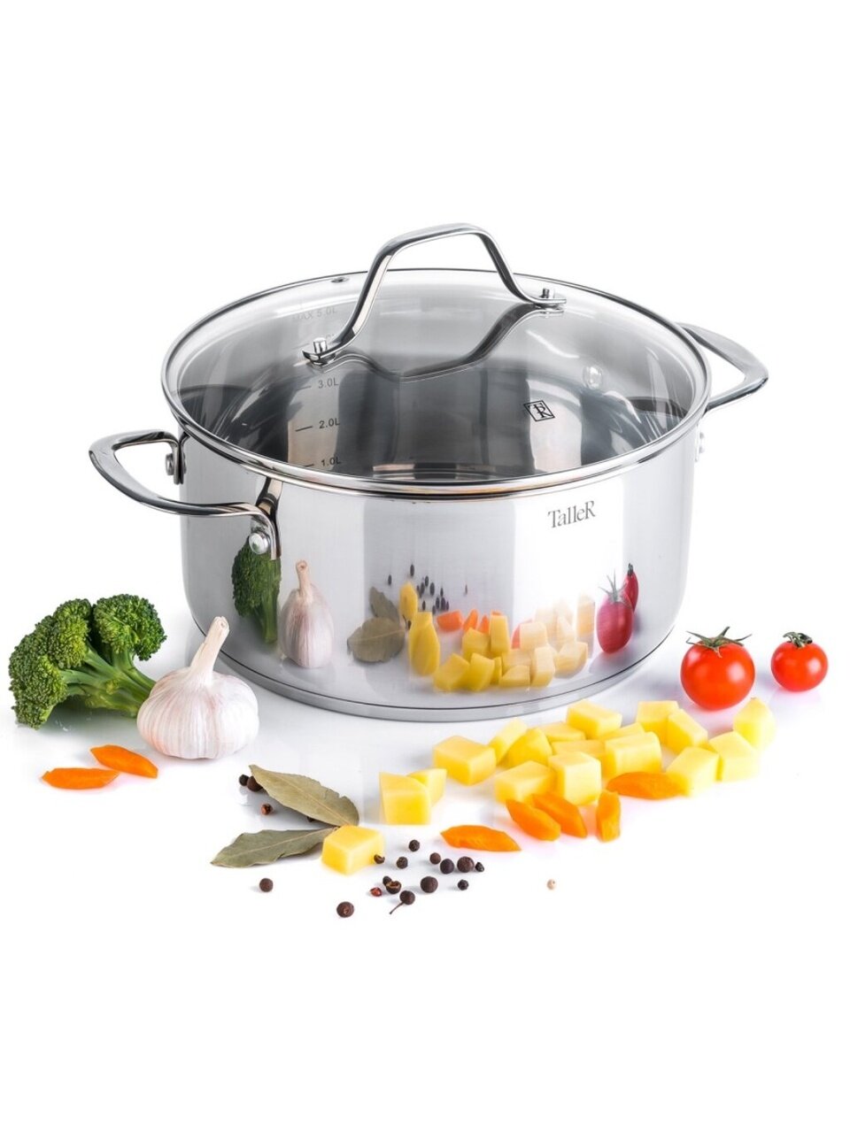 Кастрюля TalleR "Элиас" - качественная кухонная утварь для варки, тушения, томления на конфорках любых типов, включая индукционные. Толстые стенки (0,6 мм) и дно (2,8 мм) обеспечат равномерное распределение тепла.