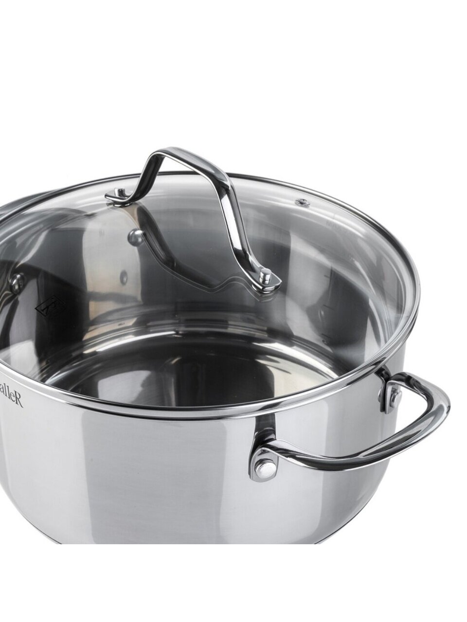 Ёмкость выполнена из нержавеющей стали 18/10. Это сплав, в состав которого включены хром и никель. Такое сочетание не только исключает появление коррозии, но и делает посуду более прочной и устойчивой к механическим повреждениям. Прилагается стеклянная крышка, оснащённая стальным ободком для плотного прилегания. Паровыпускной клапан позволит избежать выкипания жидкости.