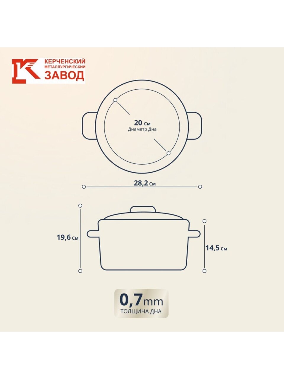 Диаметр дна и крышки — 20 см, высота с крышкой — 19,6 см, без крышки — 14,5 см, вес — 1,15 кг, толщина дна — 0,7 мм.