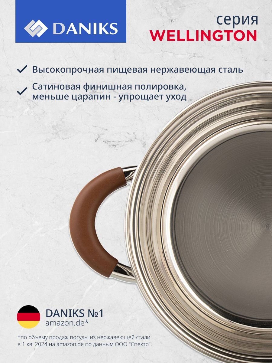 Кастрюля из нержавеющей стали 2 л Daniks Веллингтон с капсульным дном и стеклянной крышкой — идеальный выбор для быстрой готовки на индукции, дома и на даче.