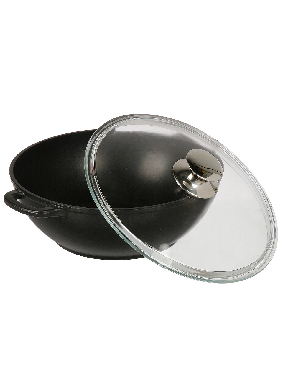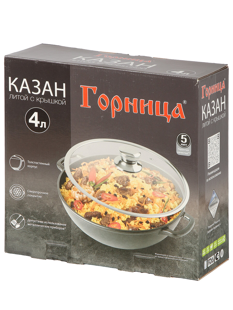 Литой алюминиевый казан с антипригарным покрытием подходит для газовых, электрических и стеклокерамических плит, а также для открытого огня.