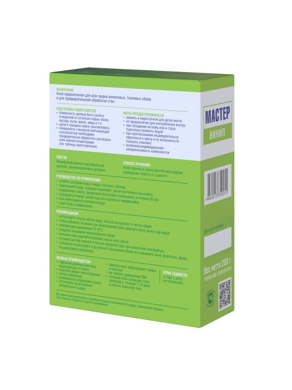 Клей профессиональный предназначен для всех типов обоев, в зависимости от его концентрации в водном растворе, и для предварительной обработки стен. Клей внутри пачки герметично запечатан и надежно защищен от влаги. Соответствует всем евростандартам. Не требует добавления ПВА. Экологически чистый. Хорошо впитывается. Препятствует образованию грибка и появлению насекомых.